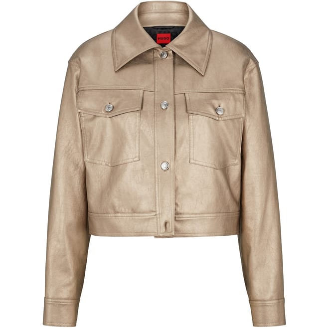 This Hugo trucker jacket features a point collar and a button closure, offering a classic look. Designed in a regular fit with a short length, it includes practical embellishments such as flap pockets and a button placket. The solid pattern and straight hem add to its timeless appeal, while the barrel cuffs complete the design. -