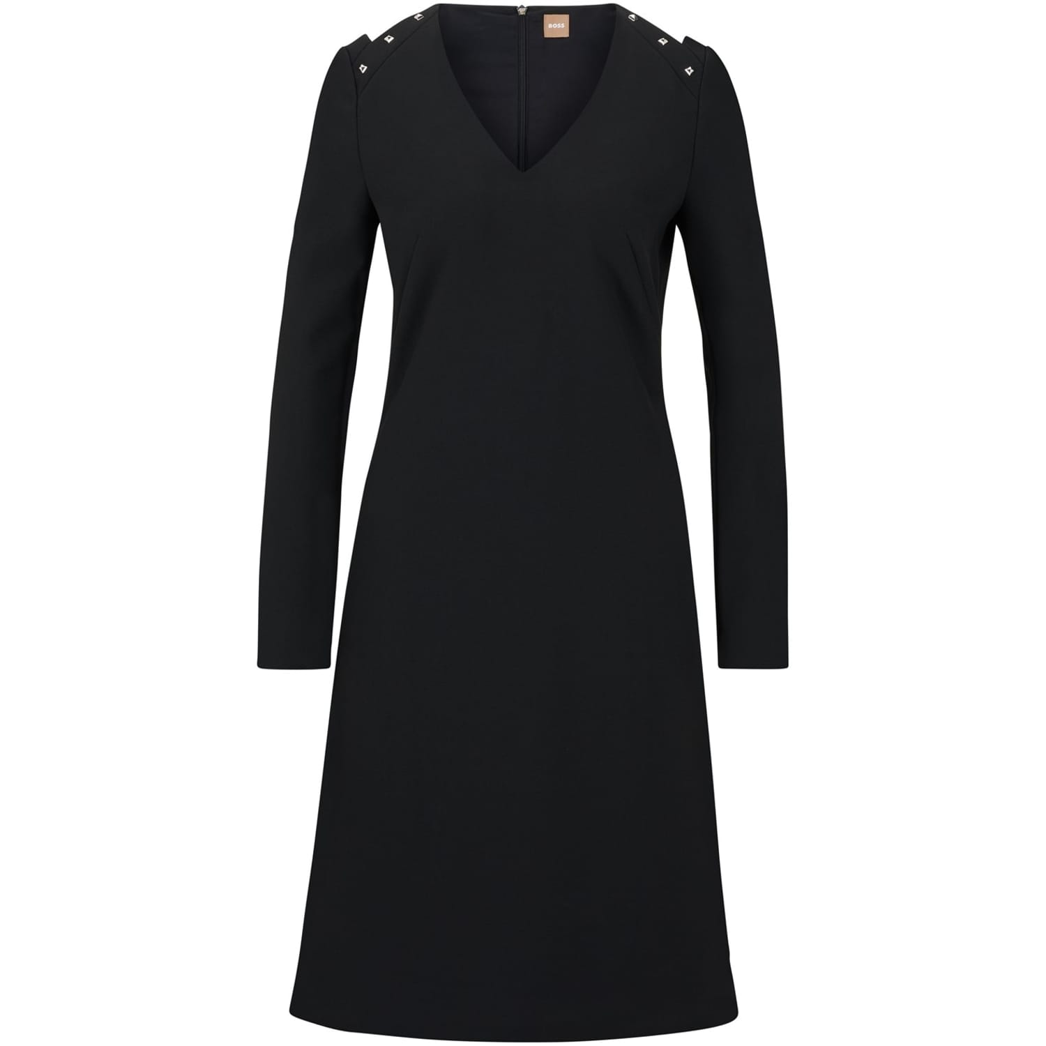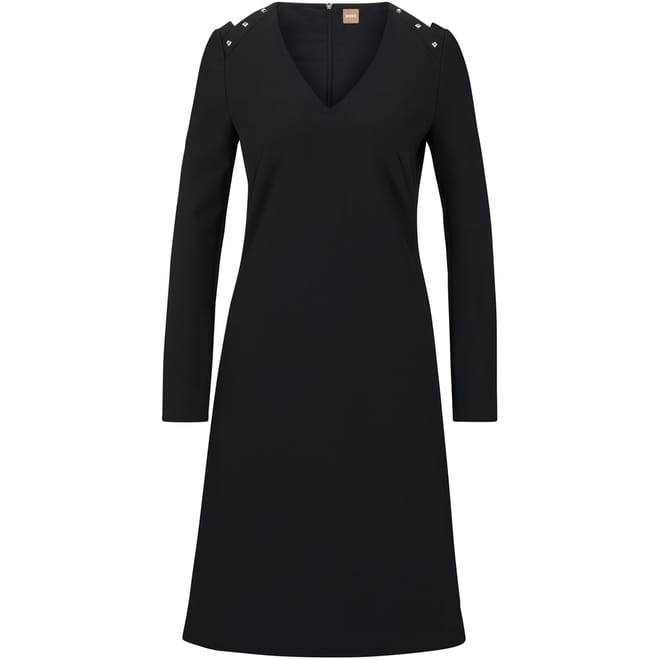 This Boss midi A-line dress features a sophisticated V-neck and a straight hem, offering a timeless silhouette. The solid pattern enhances its elegance, while the back zipper ensures a seamless fit. Designed with long sleeves, this regular fit dress is perfect for any occasion, combining style and comfort effortlessly. -