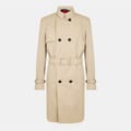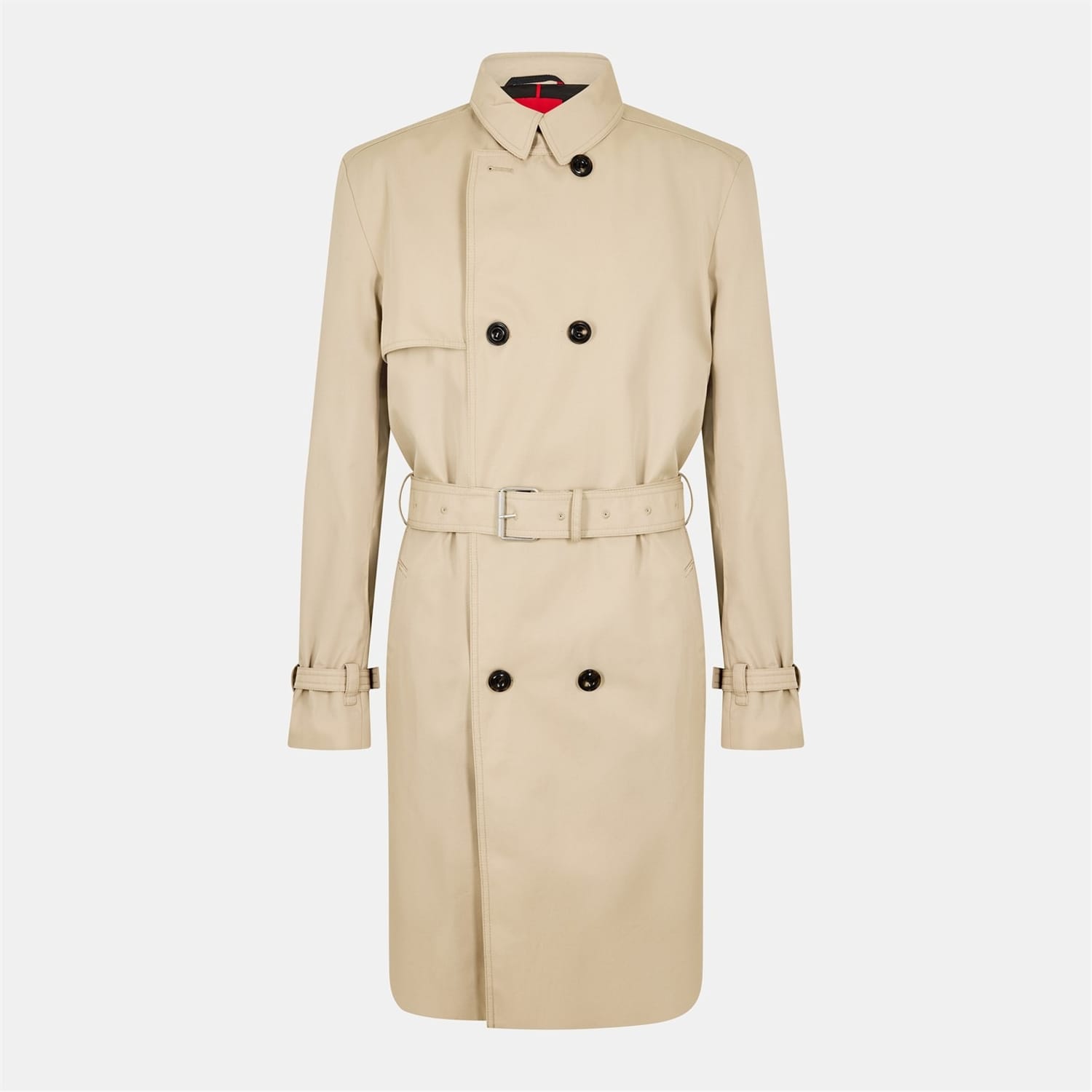This Hugo trench coat is a sophisticated addition to your wardrobe. Featuring a point collar and a straight hem, it offers a regular fit for comfortable wear. The coat is designed with a button and belt closure, adding a touch of elegance. Cuff sleeves with roll-up cuffs and practical pockets complete the solid pattern design, making it a versatile choice for various occasions. -
