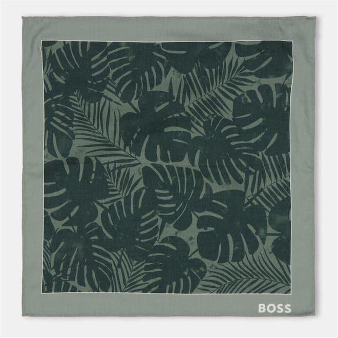 Elevate your accessory collection with this Boss pocket square scarf. Featuring a sophisticated leaf print pattern, this scarf is designed with a convenient pocket and adorned with a subtle logo embellishment. Perfect for adding a touch of elegance to any outfit, this scarf combines style and functionality seamlessly. -