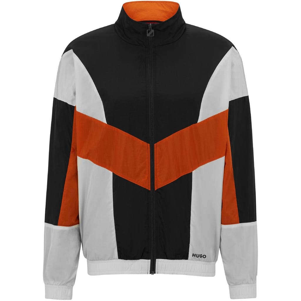 This Hugo bomber jacket features a stylish color block pattern and a short length, perfect for a modern look. Designed with a regular fit, it offers a comfortable mid-weight feel. The jacket is equipped with a convenient zipper closure, making it both practical and fashionable for any occasion. -