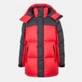Hugo's puffer jacket features a hooded neckline and a regular fit, offering both style and comfort. The jacket showcases a colour block pattern and includes a practical zipper closure. It is designed with a straight hem and zipped pockets, providing functionality and a modern look. -