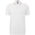 This Boss top features a classic polo collar and short sleeves, offering a regular fit. The solid pattern is complemented by a subtle logo embellishment, adding a touch of brand identity. -
