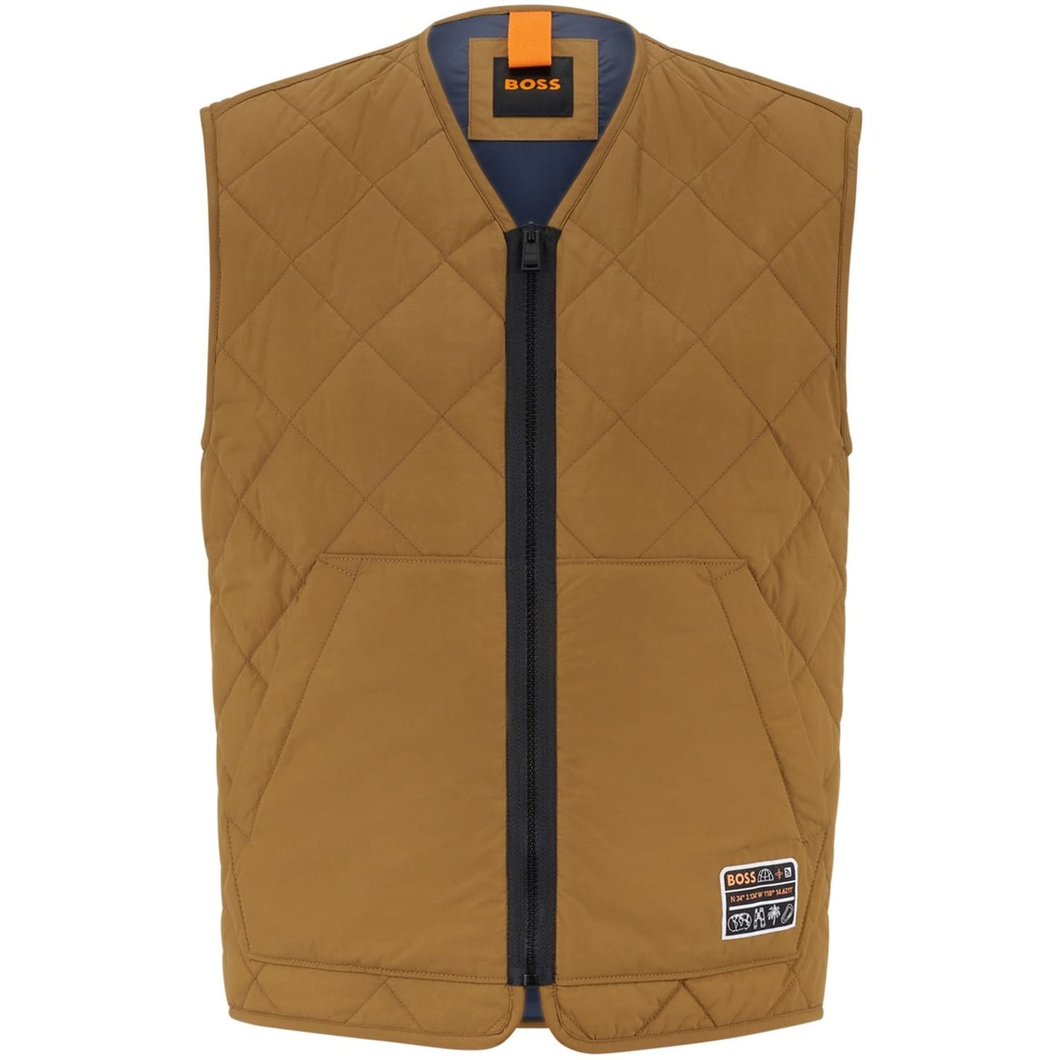 This Boss gilet features a regular fit and a straight hem, offering a sleek and modern look. The design includes a practical zipper closure and convenient pockets, making it both functional and stylish. Perfect for layering, this sleeveless piece is a versatile addition to any wardrobe. -