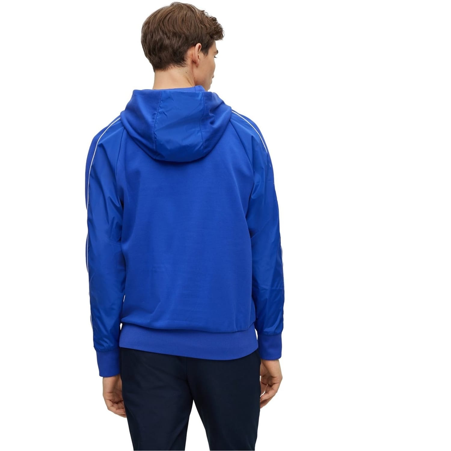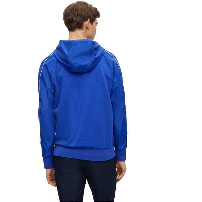 This Boss top features a hooded neck and long raglan sleeves, offering a regular fit. The solid pattern is complemented by a subtle logo embellishment, adding a touch of brand identity. Ribbed cuffs provide a comfortable finish, making it a versatile addition to your wardrobe. -