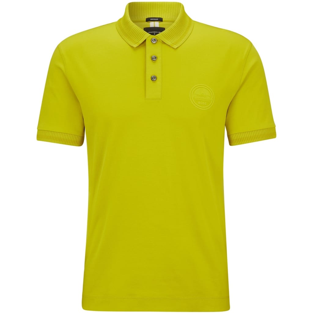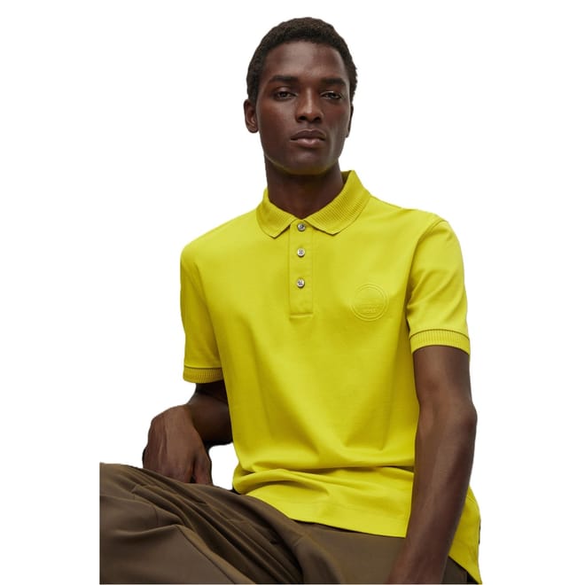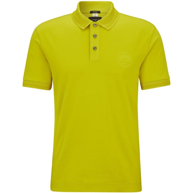 This Boss top features a classic polo collar and short sleeves, offering a regular fit. The solid pattern adds a timeless touch, while the ribbed cuffs provide a refined finish. Ideal for a versatile wardrobe staple. -