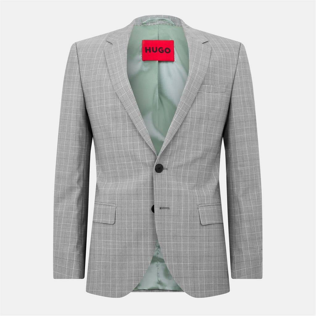 This Hugo suit jacket features a classic notch collar and a straight hem. Designed with a regular fit, it showcases a sophisticated plaid pattern. The jacket is adorned with a subtle logo embellishment, adding a touch of brand identity. A button closure completes the design, ensuring a polished appearance. -