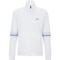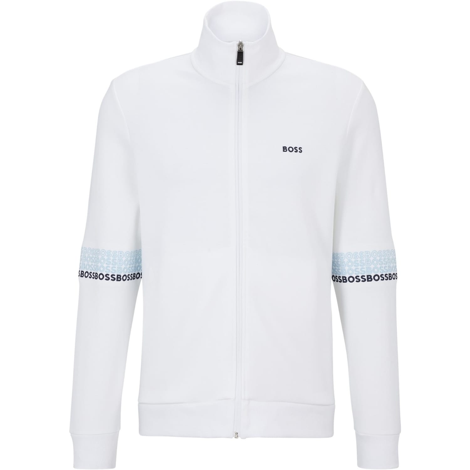 This Boss top features a zip neck and long sleeves, offering a regular fit. The solid pattern is complemented by a subtle logo embellishment and lettering graphic. It includes a ribbed cuff for added comfort and style. The front zipper closure adds a practical touch to this elegant piece. -