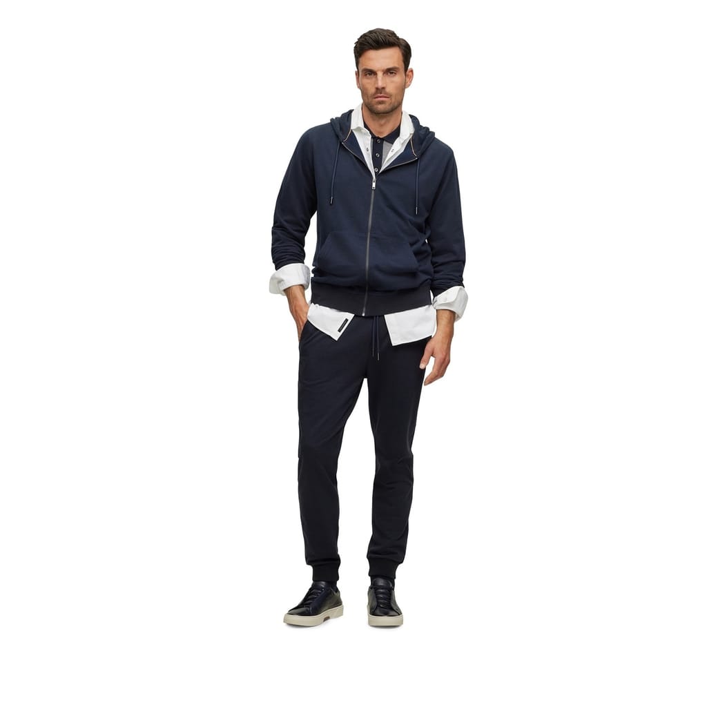 This Boss sweatshirt jacket features a hooded design with a zipper closure, offering a practical and stylish option for cooler days. The regular fit ensures comfort, while the ribbed cuffs and hem add a touch of detail. With a solid pattern and convenient pockets, this short-length jacket is a versatile addition to any wardrobe. -