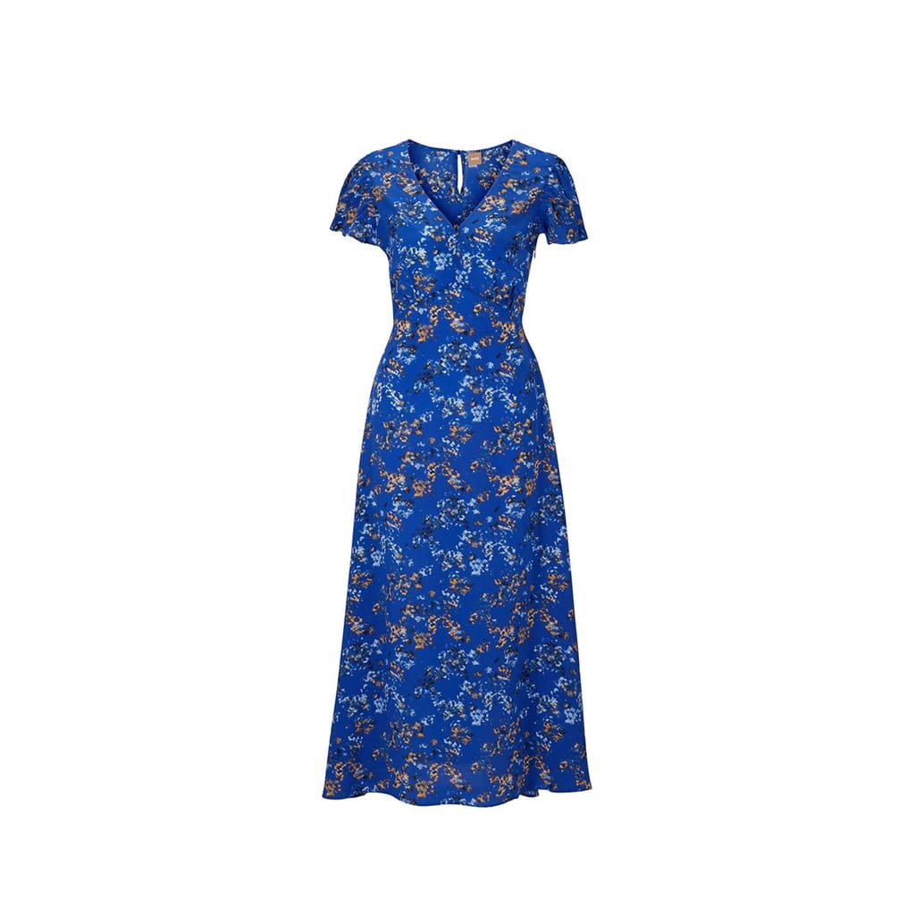 This Boss maxi dress features a charming floral pattern, perfect for any occasion. The A-line design is complemented by a flattering V-neck and flutter sleeves, offering a touch of elegance. The straight hemline adds a classic finish to this stylish piece. -