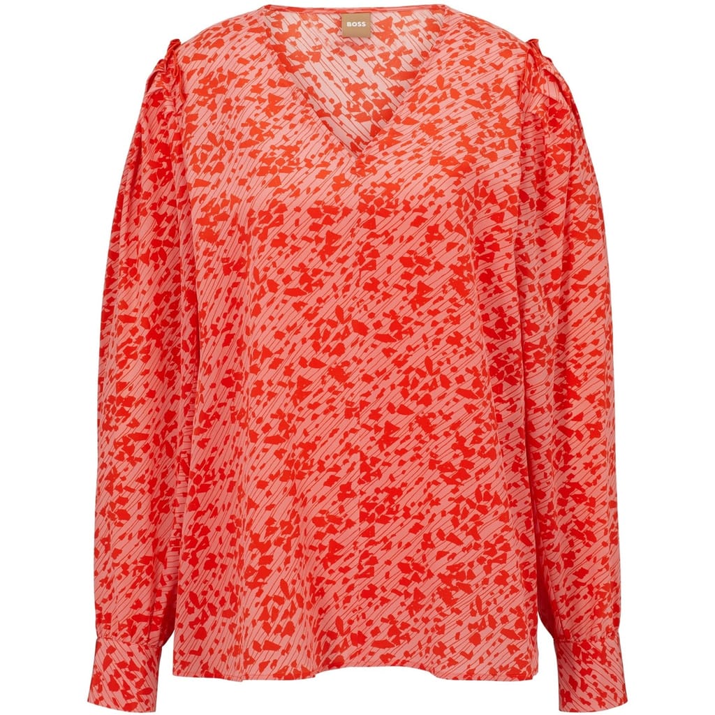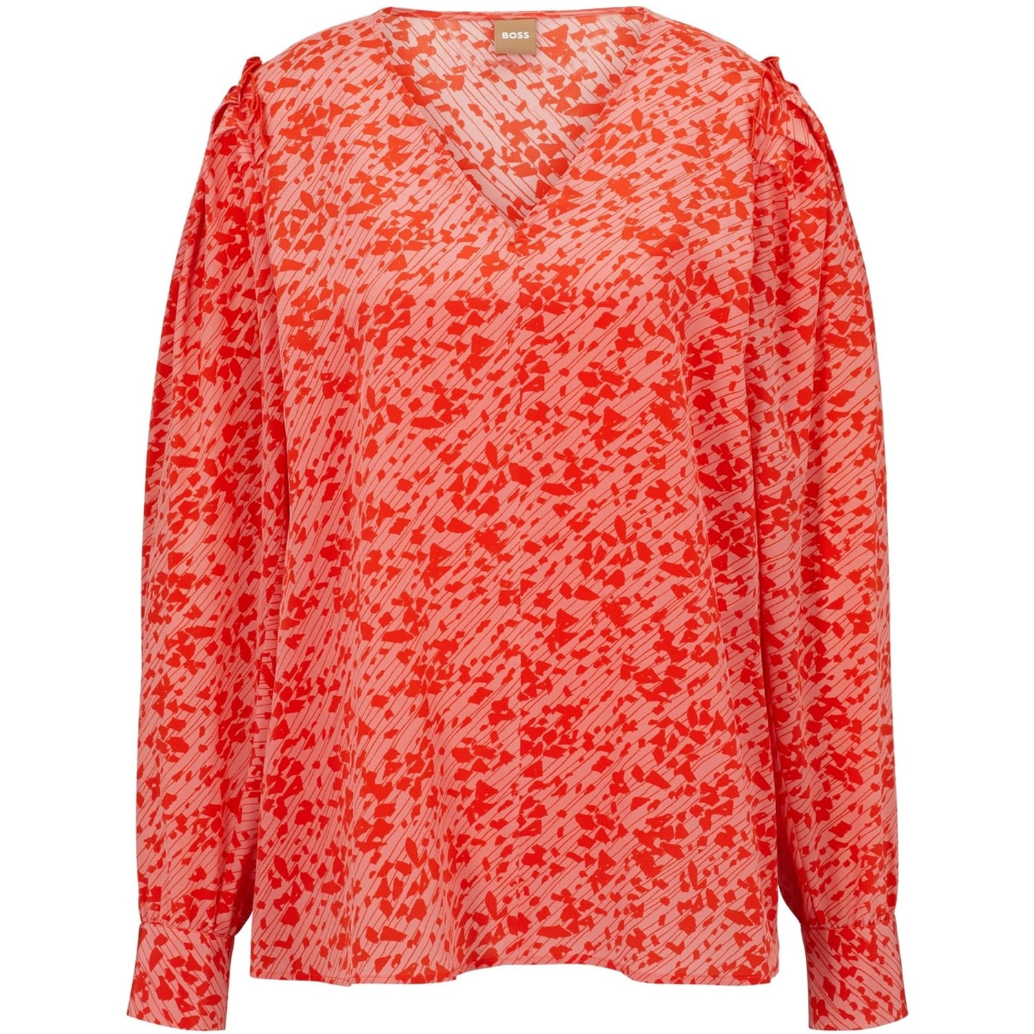 This Boss top features a relaxed fit with long puff sleeves and a stylish V-neck. The abstract pattern adds a modern touch, while the logo embellishment provides a subtle brand statement. Perfect for those seeking a blend of comfort and contemporary design. -