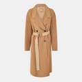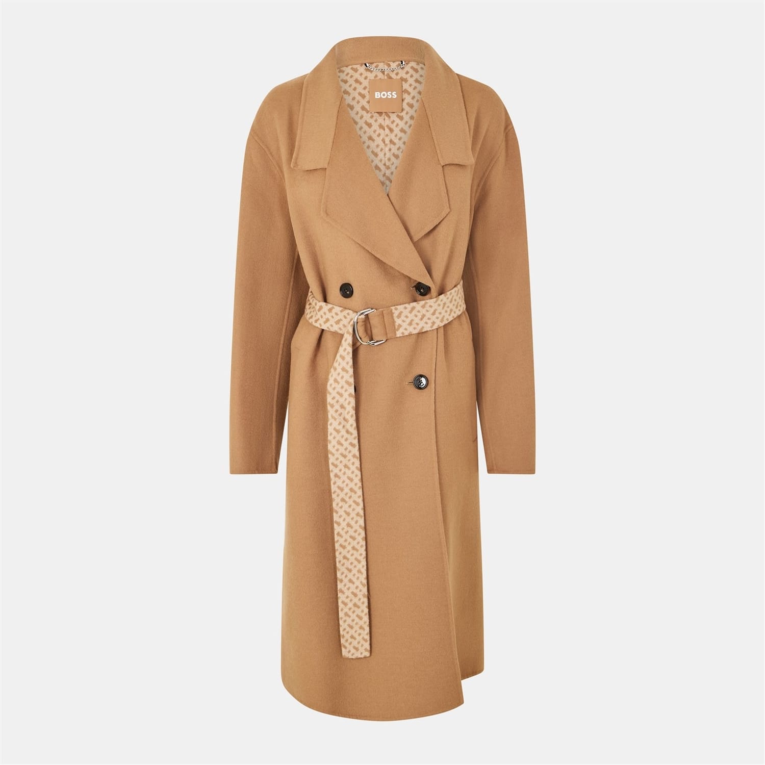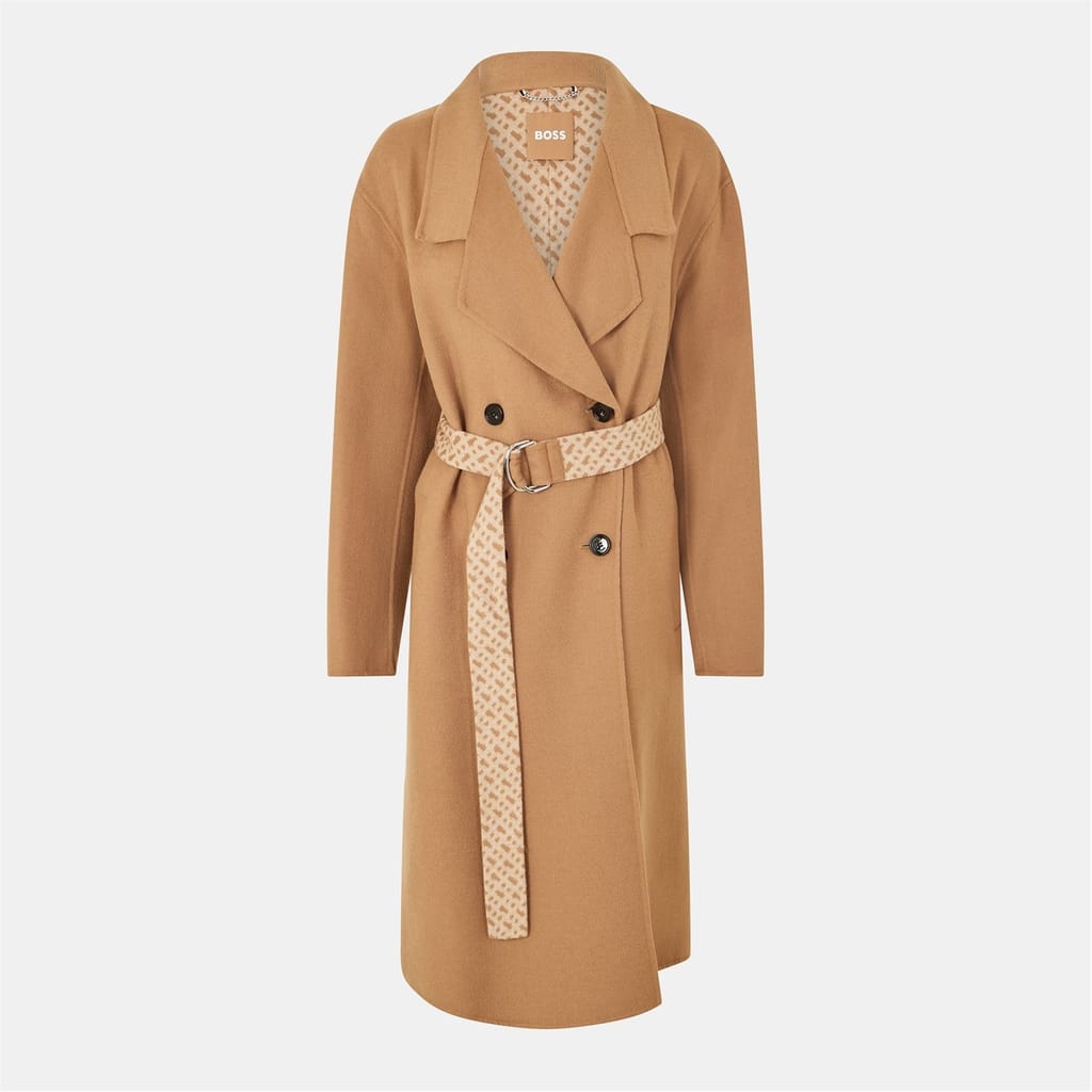This Boss overcoat features a lapel collar and a straight hem, offering a relaxed fit. The solid pattern is complemented by a button closure and a belt, adding a touch of sophistication. The monogram embellishment adds a subtle brand detail, making it a stylish choice for any wardrobe. -