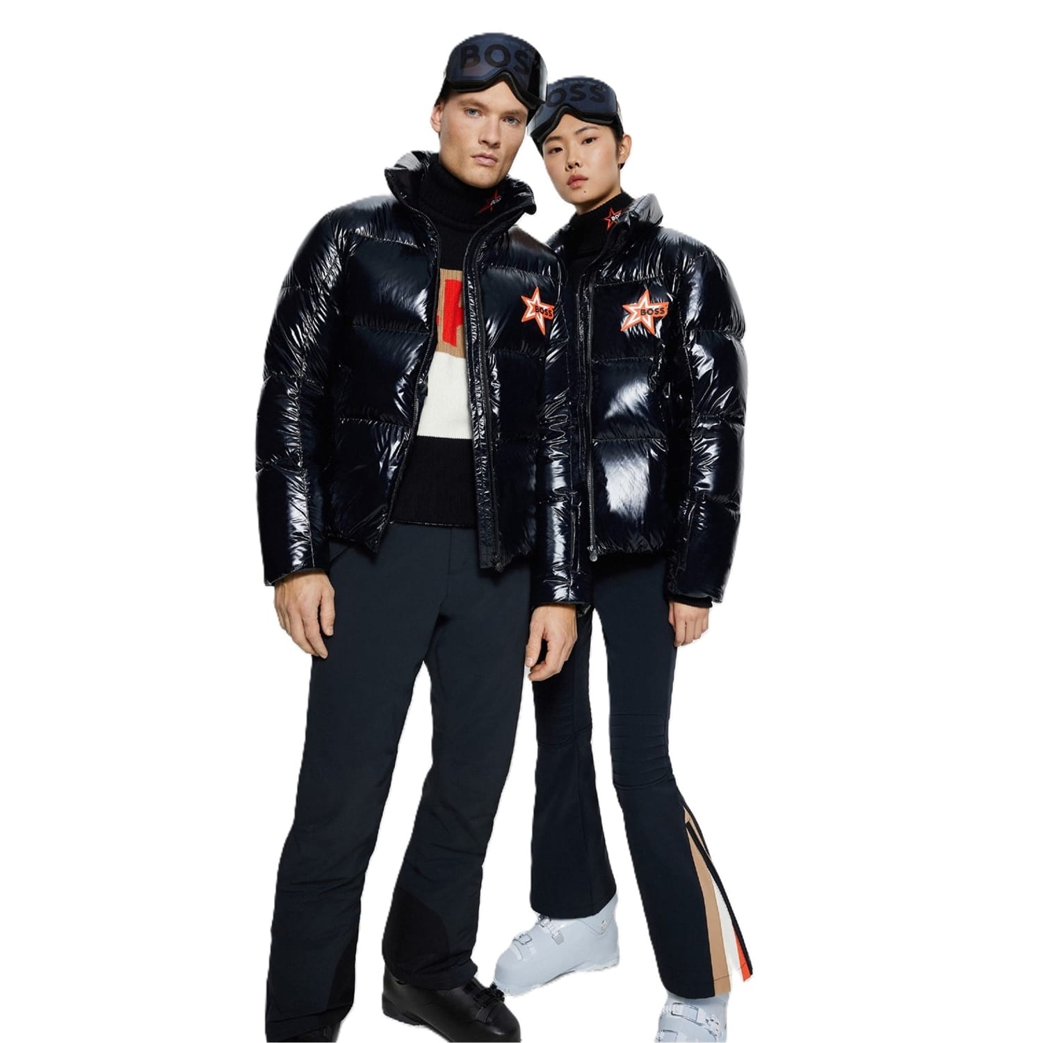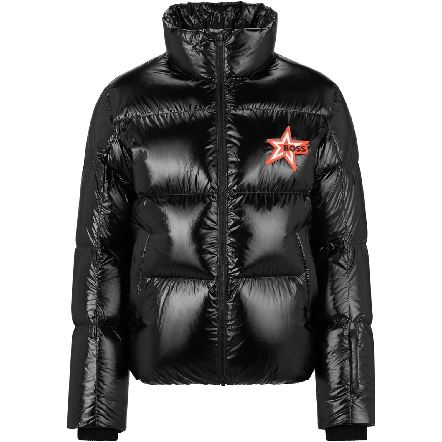 This Boss ski jacket features a solid pattern with a regular fit, offering both style and comfort. It includes a zipper closure and a straight hem, complemented by ribbed cuffs. The jacket is adorned with a logo embellishment, adding a touch of brand identity. -
