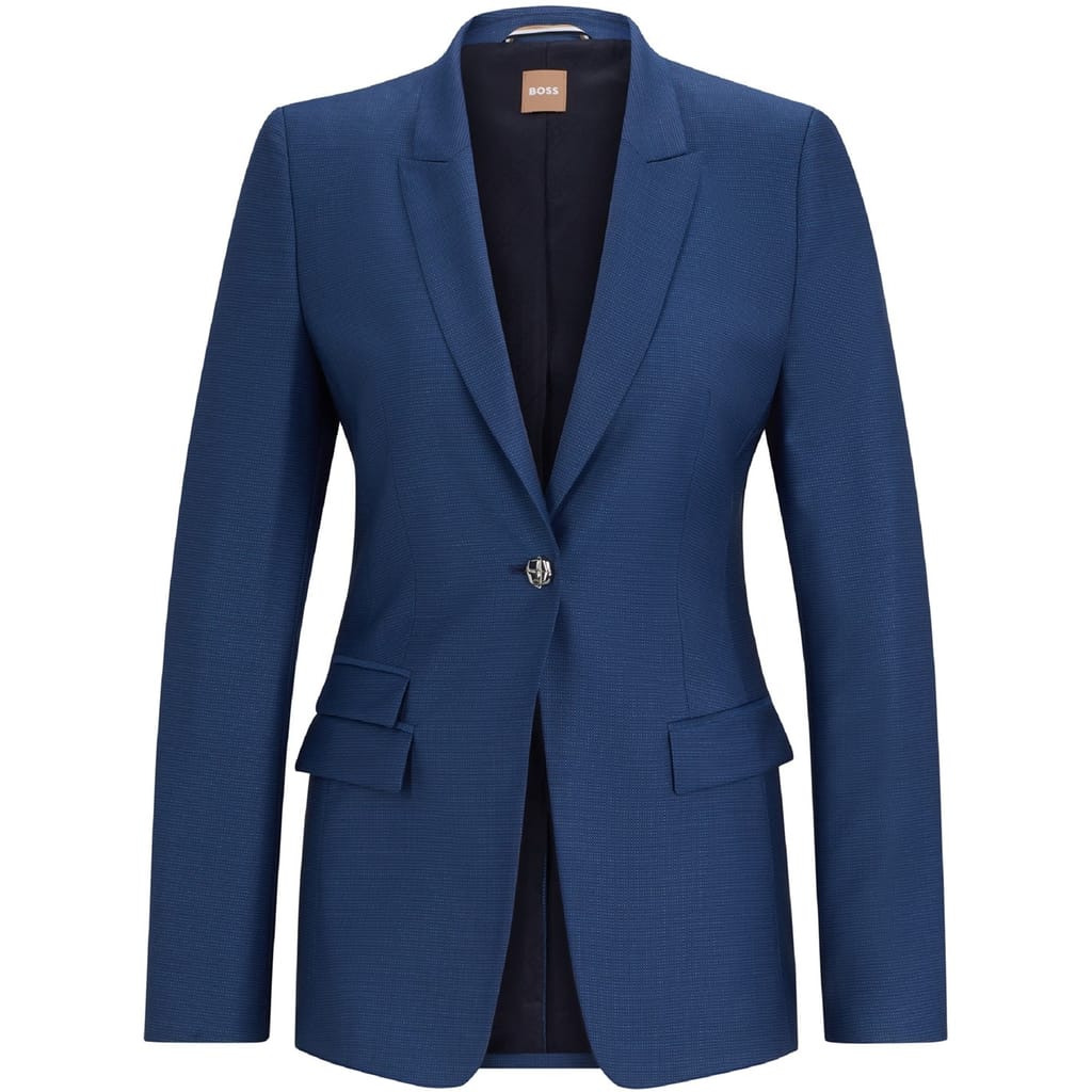 This Boss blazer is a sophisticated addition to any formal collection. Crafted with a lapel collar and a single-button closure, it offers a slim fit for a sleek silhouette. The solid pattern and straight hemline enhance its classic appeal, making it a versatile choice for various occasions. -
