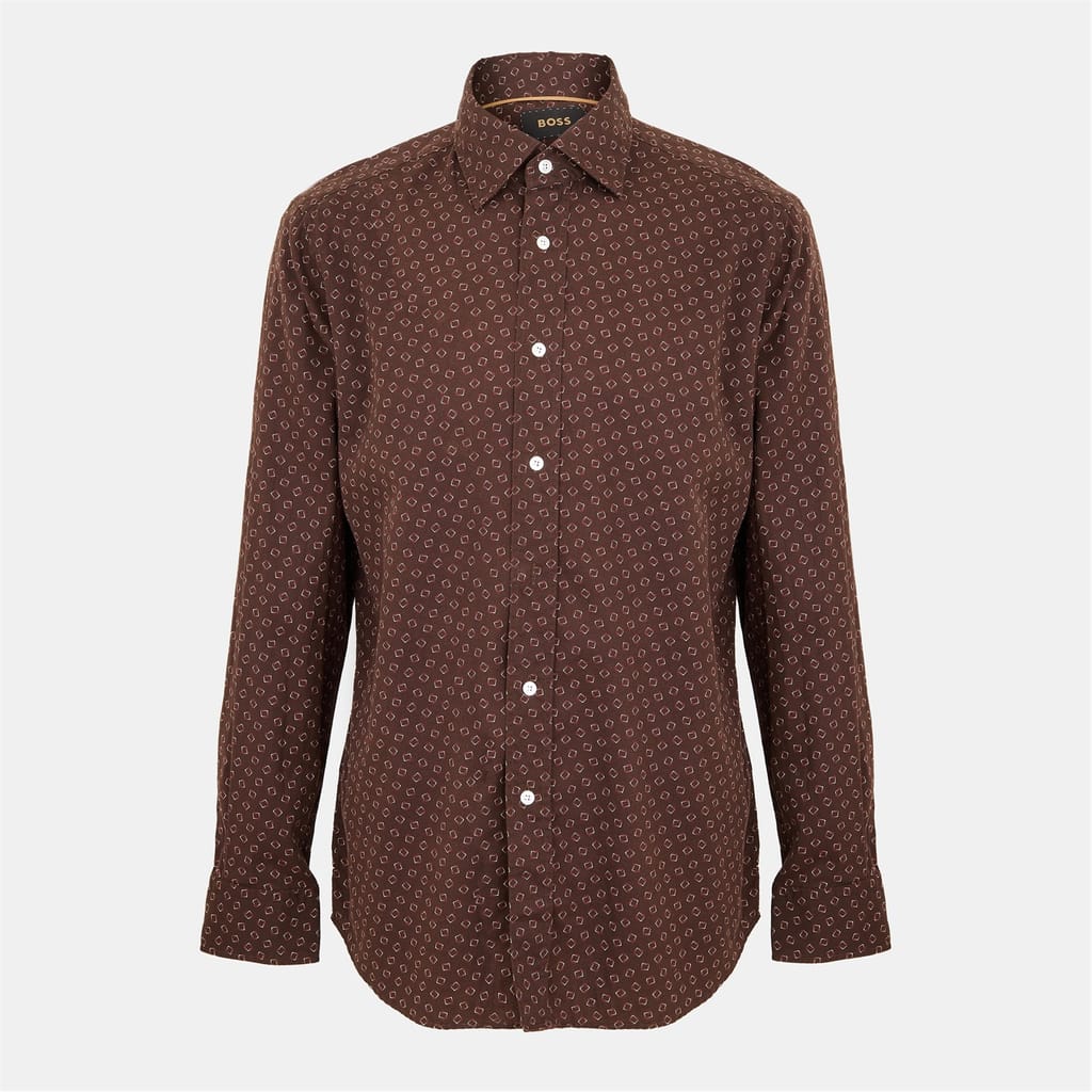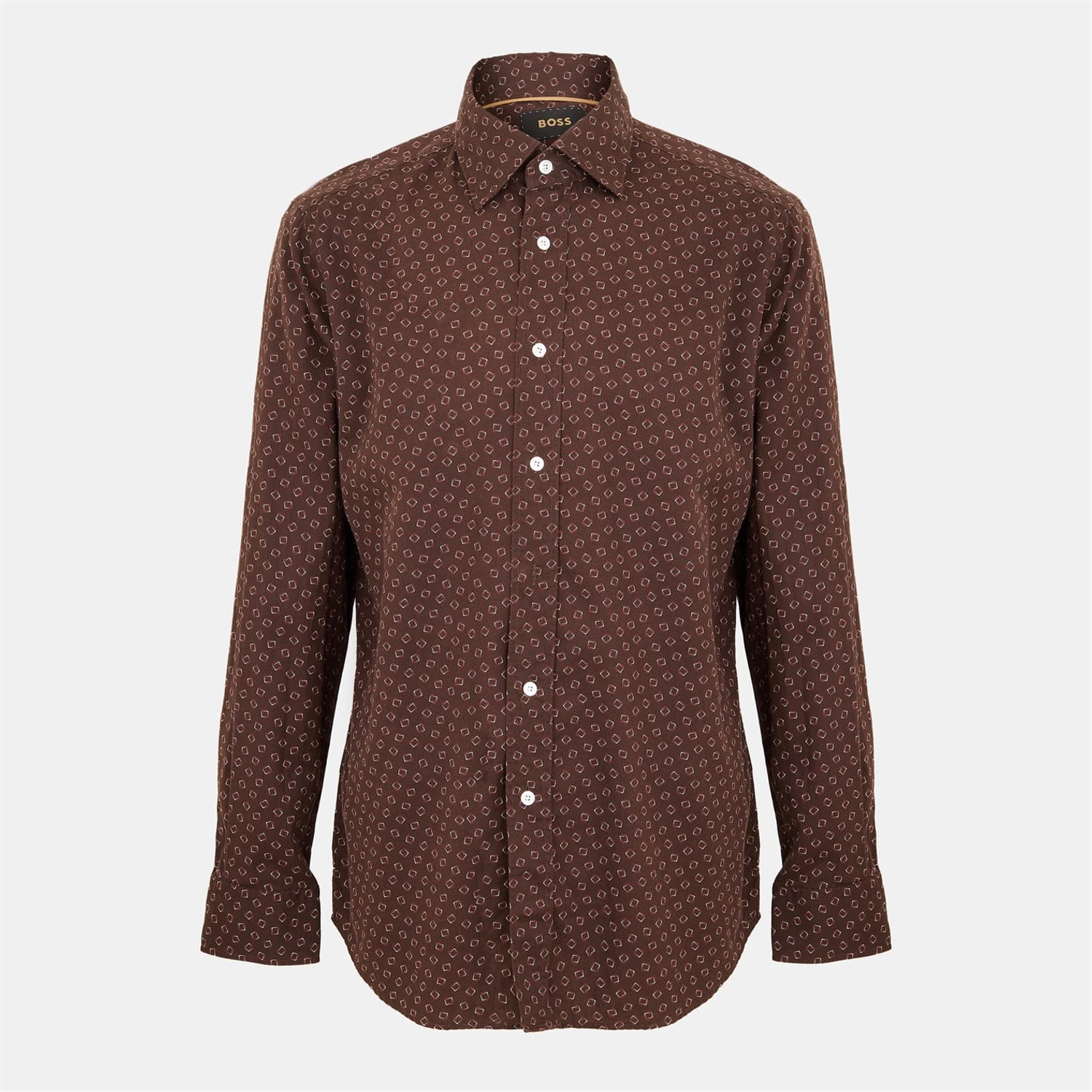 This Boss top features a geometric pattern and a point collar, offering a sophisticated look. Designed with long sleeves and a button closure, it ensures a comfortable regular fit. Ideal for those seeking a blend of style and functionality. -
