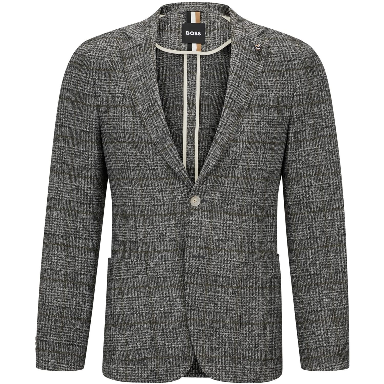 This Boss blazer is a sophisticated addition to any formal collection. Featuring a classic notch collar and a straight hem, it offers a regular fit for comfortable wear. The plaid pattern adds a touch of elegance, while the button closure ensures a secure fit. A subtle logo embellishment completes the design, making it a refined choice for formal occasions. -