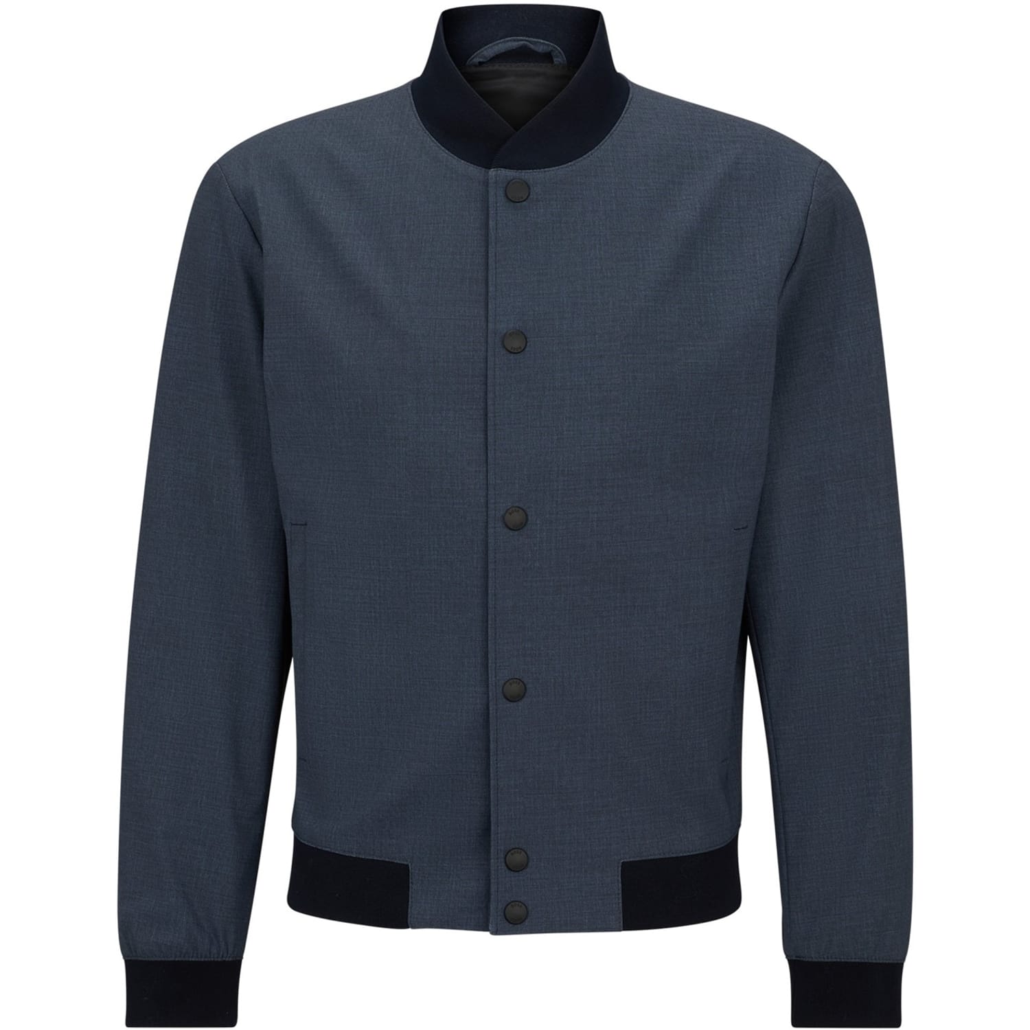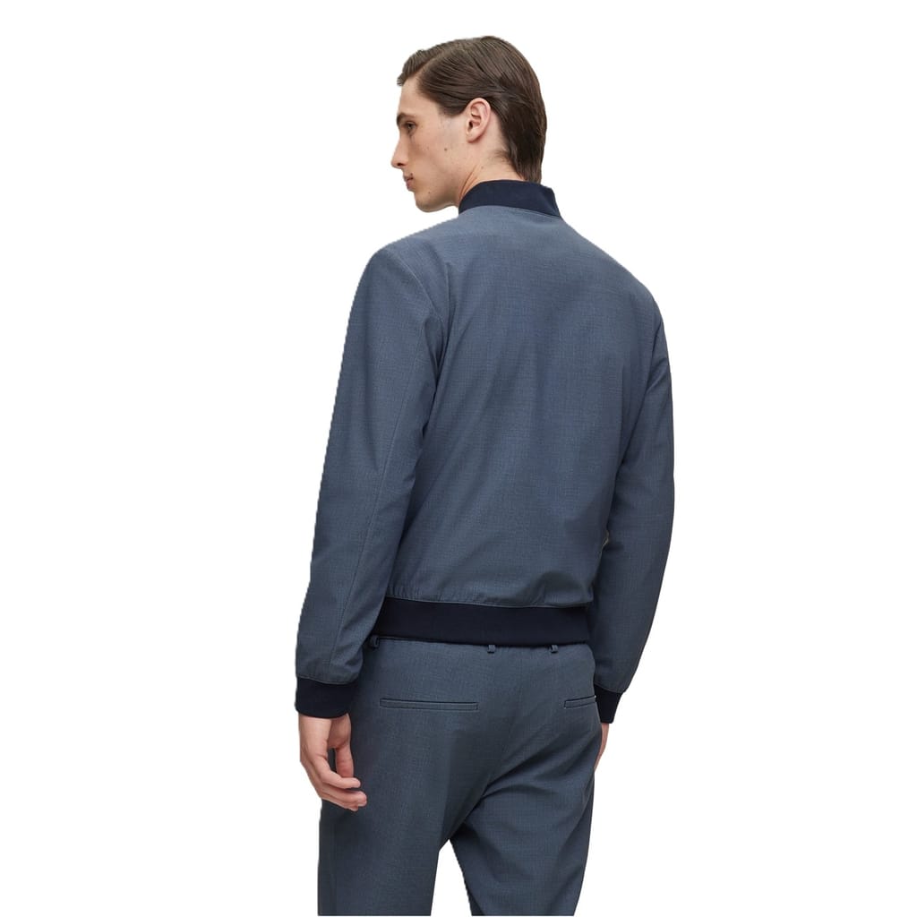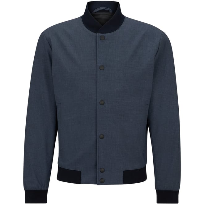 This Boss bomber jacket features a solid pattern and a regular fit, offering a classic and versatile look. It is designed with a ribbed collar, cuffs, and hem, providing a snug and comfortable fit. The jacket has a short length and a button closure, making it a practical choice for various occasions. -
