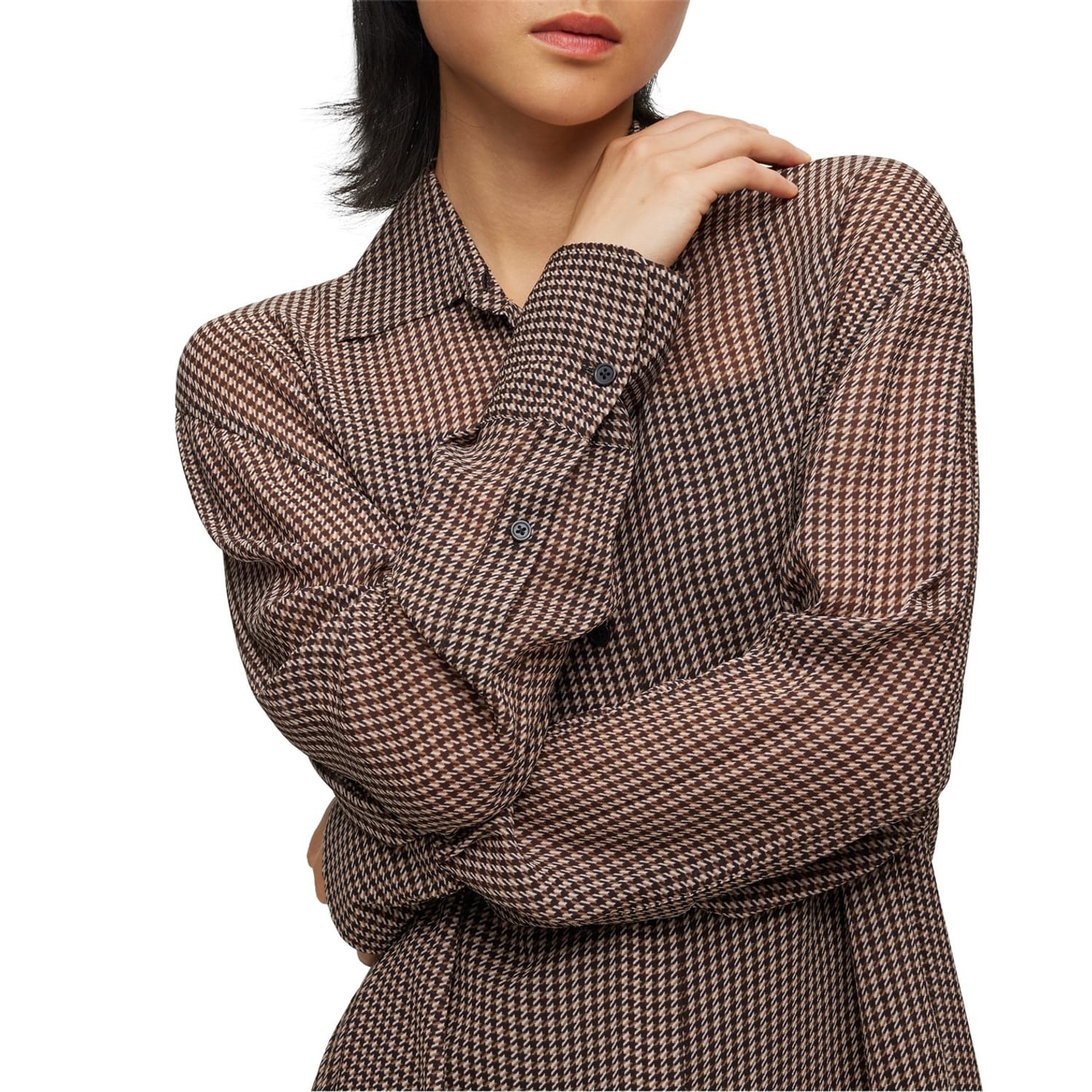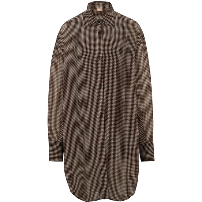 This Boss shirt dress features a classic houndstooth pattern, offering a sophisticated look. Designed with a collared neck and shirt collar, it has a knee-length cut and long cuff sleeves. The dress is finished with a curved hem and button closure, making it a stylish choice for any occasion. -