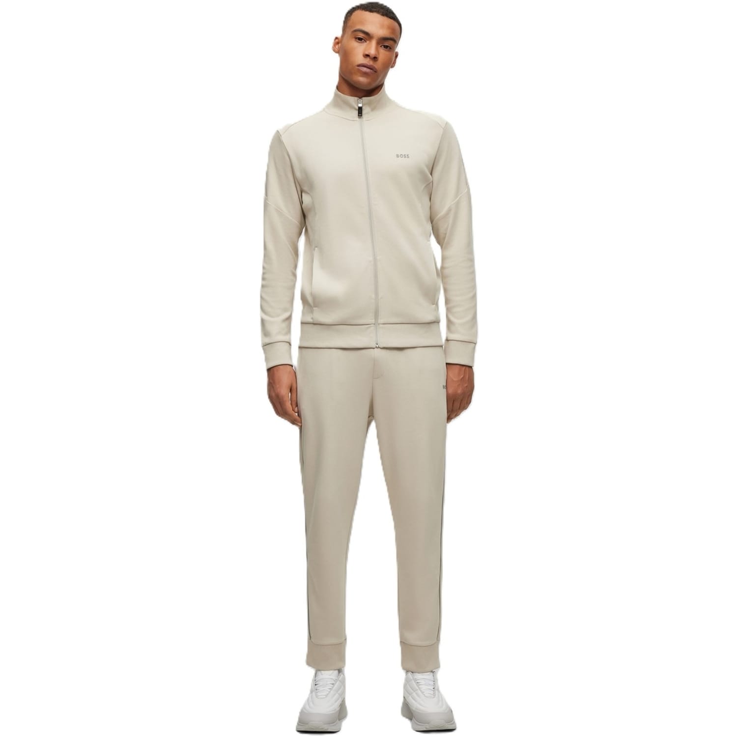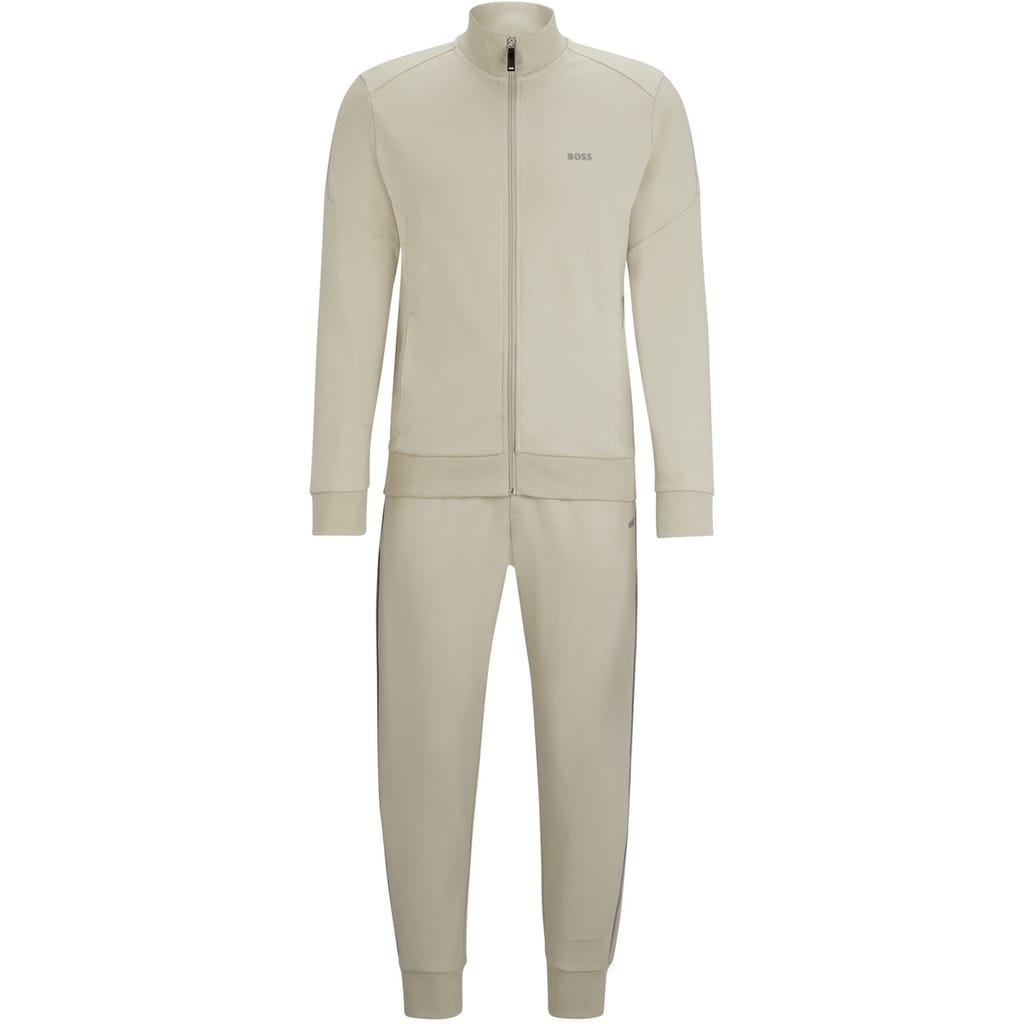 Elevate your activewear collection with this Boss full track suit. Featuring a funnel neck and zip neck design, the long sleeve top boasts a drop shoulder style for a relaxed fit. The set includes track pants, both adorned with practical pockets and a subtle logo. Perfect for those seeking comfort and style in their athletic wardrobe. -