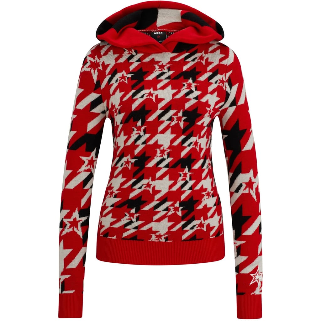 This Boss top features a classic houndstooth pattern, offering a timeless appeal. Designed with long sleeves and ribbed cuffs, it ensures a comfortable fit. The regular fit silhouette provides ease of movement, making it a versatile addition to any wardrobe. -