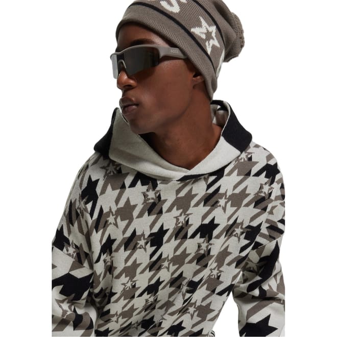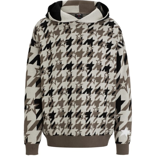 This Boss top features a houndstooth pattern and an oversized fit, offering a stylish and relaxed look. The long sleeves are complemented by ribbed cuffs, adding a touch of detail to the design. -