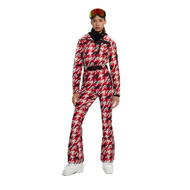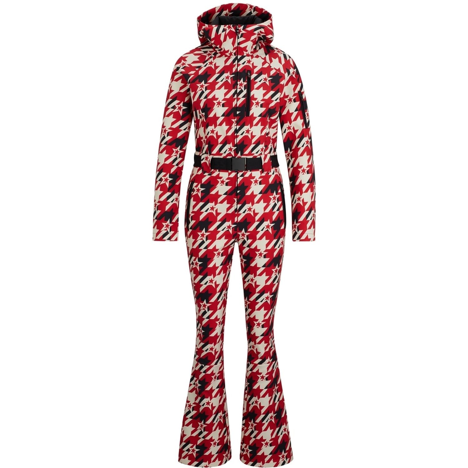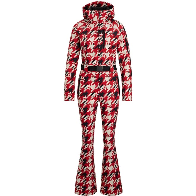 This Boss skisuit jumpsuit features a houndstooth pattern and a hooded neck, offering a stylish yet functional design. It includes a front zipper closure with a belt and buckle for a secure fit. The long plain sleeves and regular fit ensure comfort, while the front zipper and side pockets add practicality. -