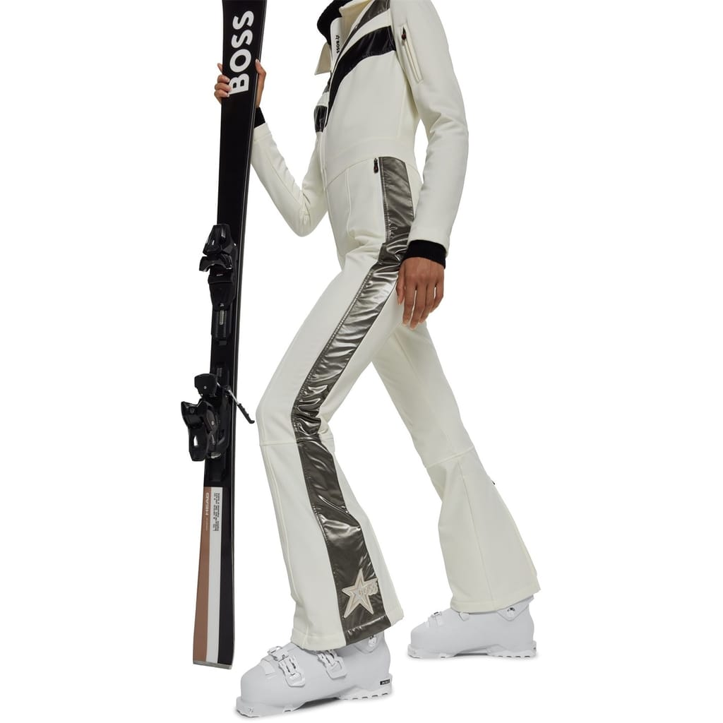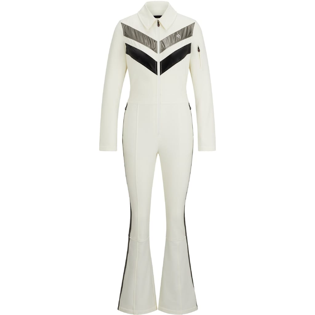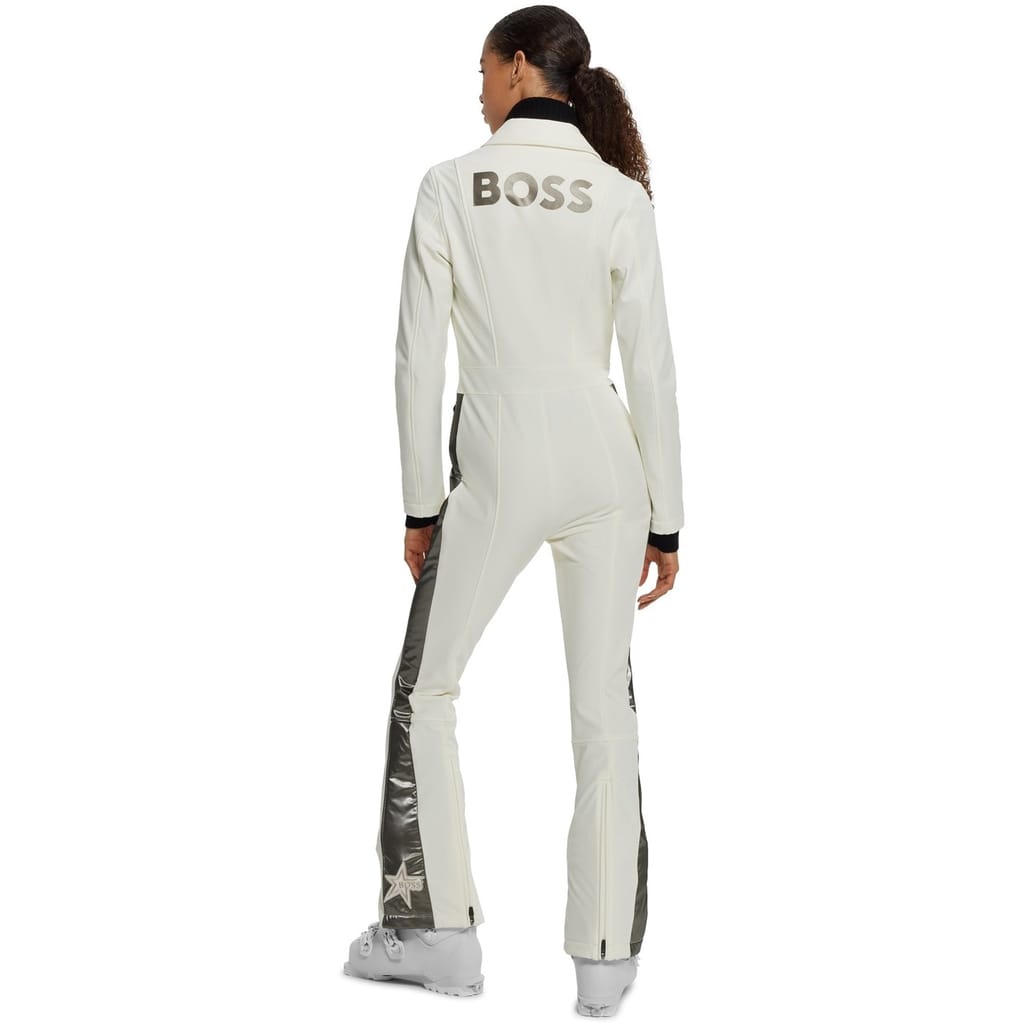 This Boss skisuit jumpsuit features a collared neck and long plain sleeves, offering a sleek and stylish look. The front zipper closure ensures easy wear, while the slim fit enhances the silhouette. The color block pattern adds a modern touch, complemented by zipped pockets and a subtle logo embellishment for a refined finish. -