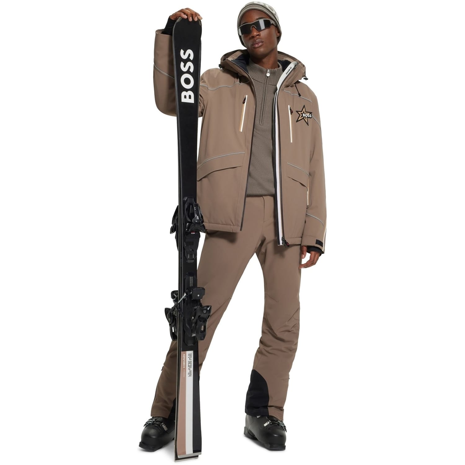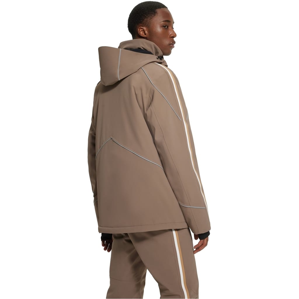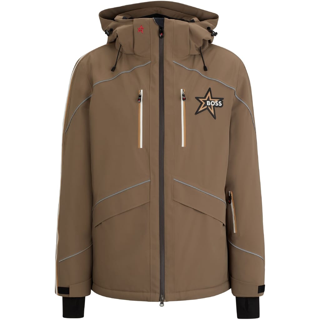 This Boss ski jacket features a hooded design and a regular fit, perfect for winter adventures. The solid pattern and straight hem offer a sleek look, while the zipper closure ensures practicality. Embellished with a logo and pockets, this jacket combines style and functionality for the colder months. -