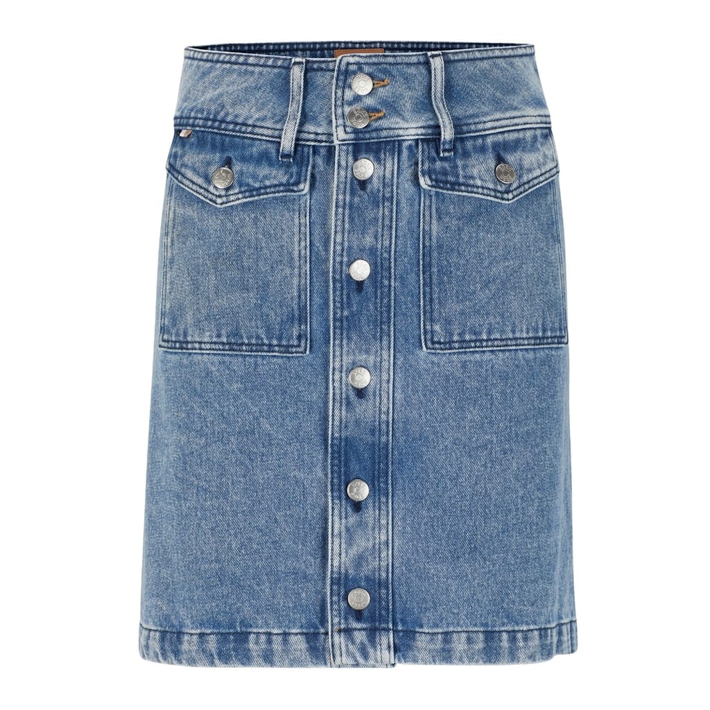 This Boss mini A-line skirt is a stylish addition to your casual collection. Featuring a regular fit, it is designed with a button closure for ease and convenience. The skirt is embellished with practical front pockets, adding a functional touch to its chic design. -