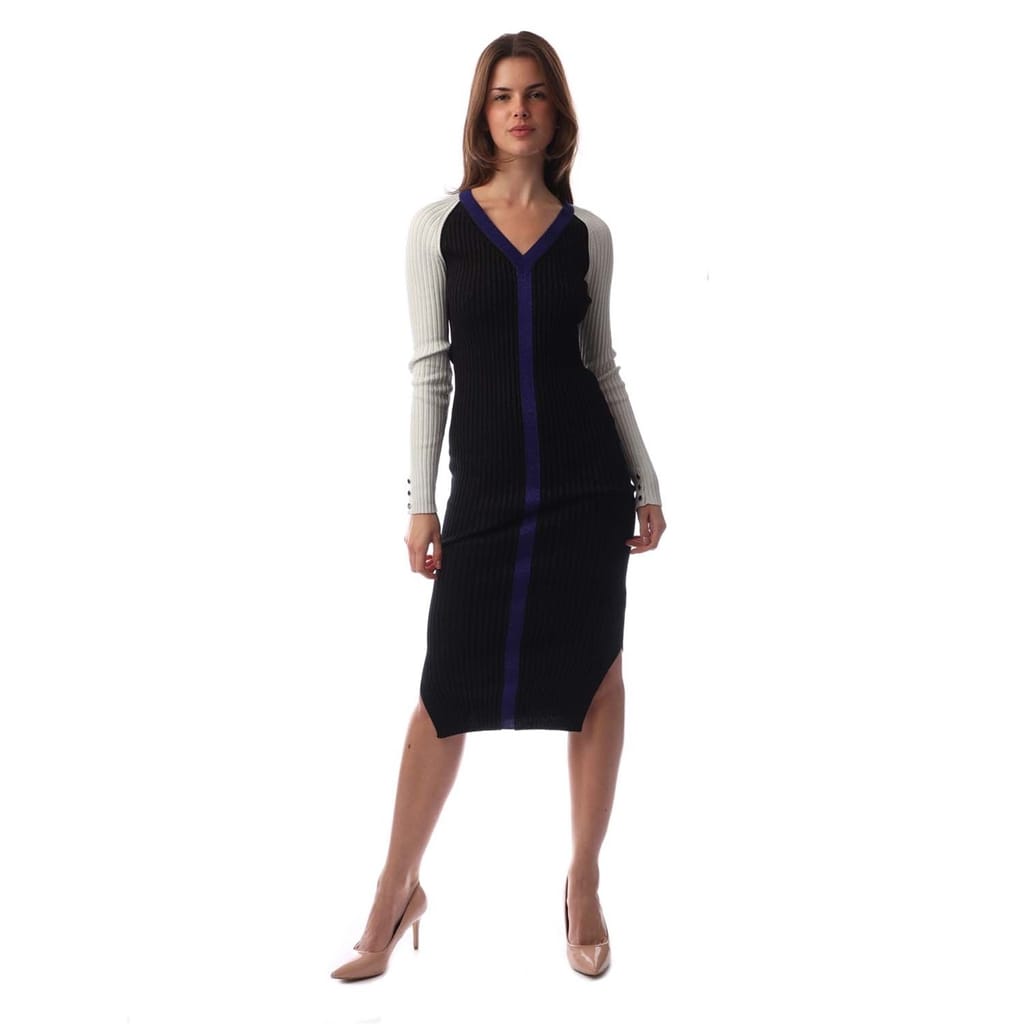 Add an opulent touch to your occasion wear with the Boss Long Sleeve Knitted Bodycon Dress. Crafted from a Viscose-blended fabrication, this longline silhouette is defined with a ribbed silhouette offering a figure-hugging fit, while the subtle metallised fibres to the trim allure a sparkling finish. Styling a flattering v-neckline, this dress offers button cuffs to the long sleeves while the colour-blocking design adds a modern flare.