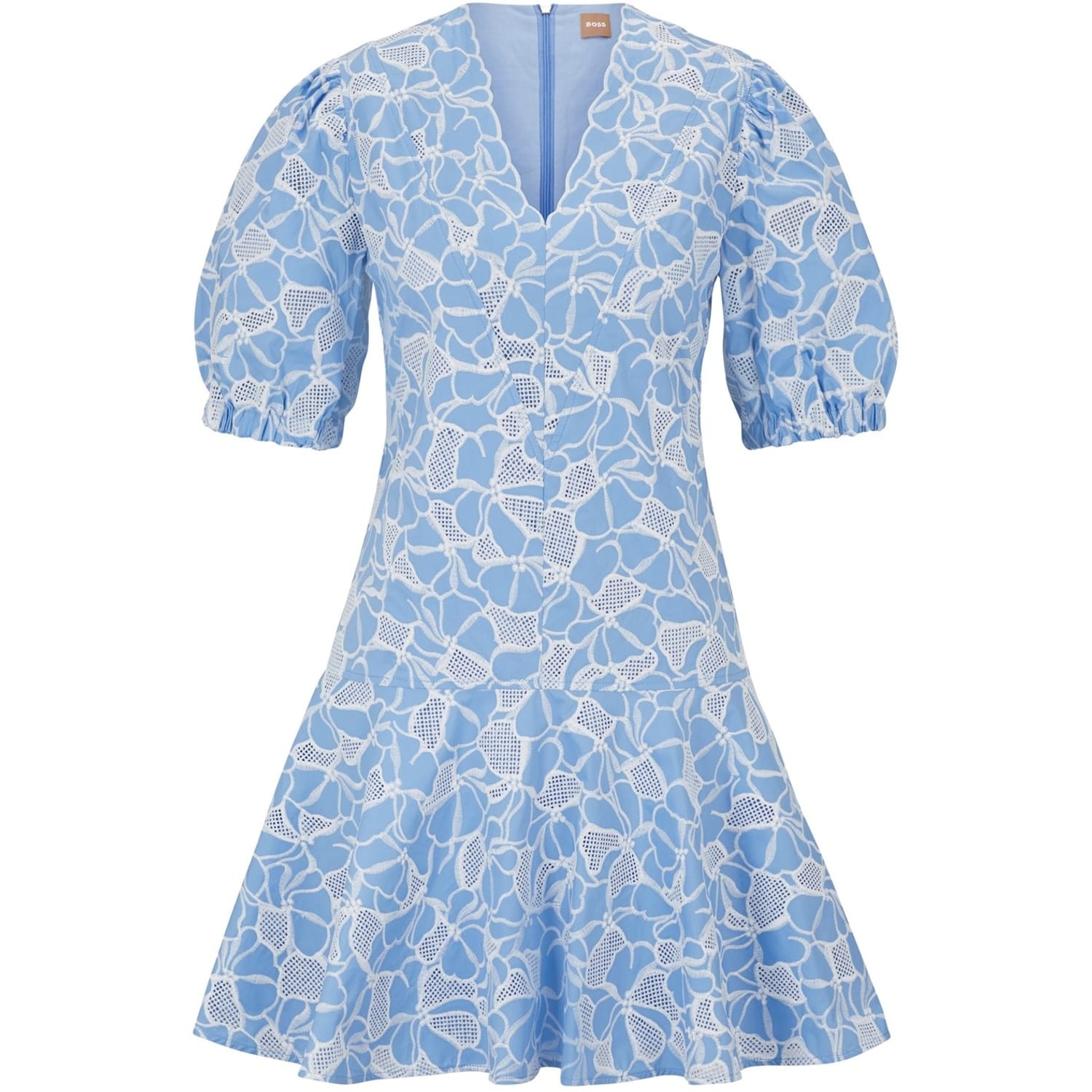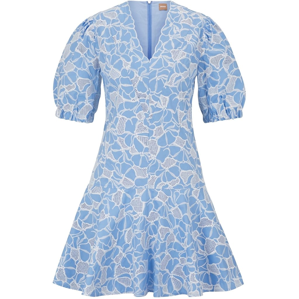 - Crafted with a meticulous eye for detail, the dress features a viscose blend fabric with a polyester blend lining, offering both comfort and sophistication. The A-frame silhouette, paired with its mini length, creates a flattering shape that celebrates the feminine form. The V neckline adds a touch of allure, while the back zip fastening ensures ease of wear. The short puffed sleeves with elasticated gathering add a playful and romantic feel to the dress. A seamed waistline beautifully accentuates the wearer's curves, while the flowy skirt creates graceful movement. Delicate floral lace detailing adds a touch of elegance and intricacy to the dress, elevating it to a statement piece. The branded metal hardware to the zip showcases the attention to detail that BOSS is renowned for. Perfect for a special occasion or an evening soiree, the Dennice Dress exudes confidence and timeless style.