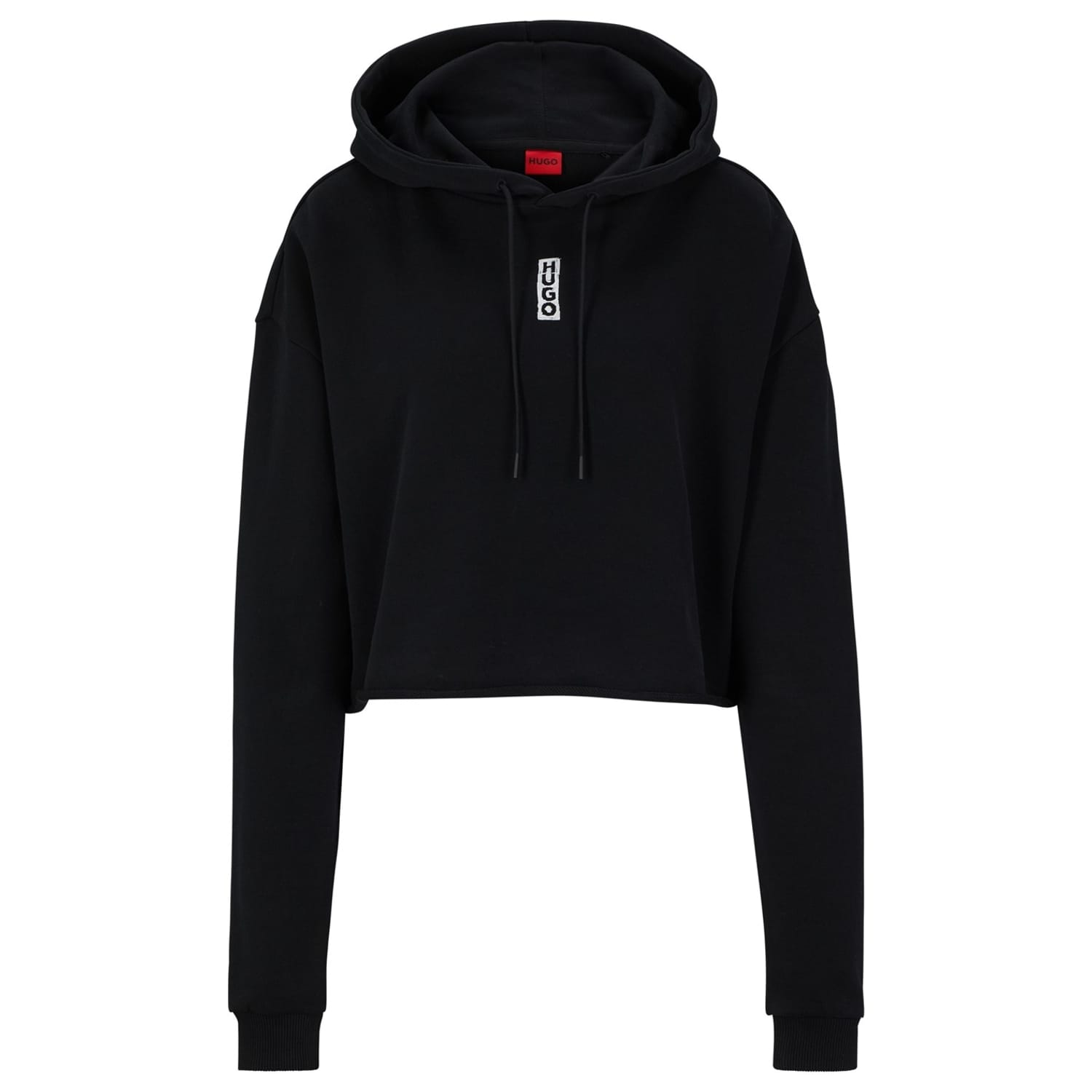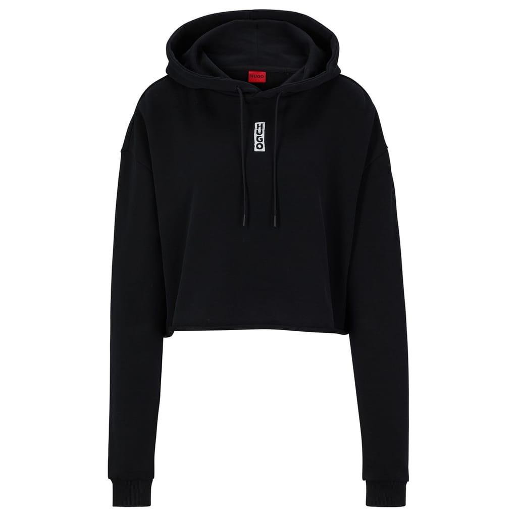 Introducing the Women's HUGO Dephana Black Hoodie - Embrace style and sustainability with this cropped hoodie from HUGO Womenswear. Crafted in peached terry fabric, it boasts vertical logos on the front and back. With your purchase, you're making a positive impact on the environment and supporting sustainable cotton farming in Africa. This CmiA labeled garment is dedicated to enhancing the lives and working conditions of African cotton farmers while preserving nature.