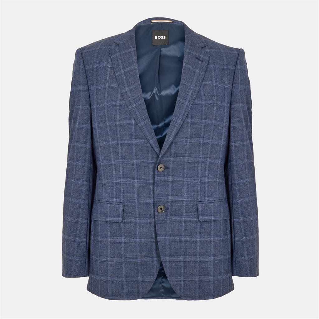 The Boss Jasper suit jacket from the formal collection features a classic plaid pattern and a notch collar. Designed with a regular fit, it includes a button closure and a straight hem. The jacket is embellished with pockets, offering both style and functionality. -