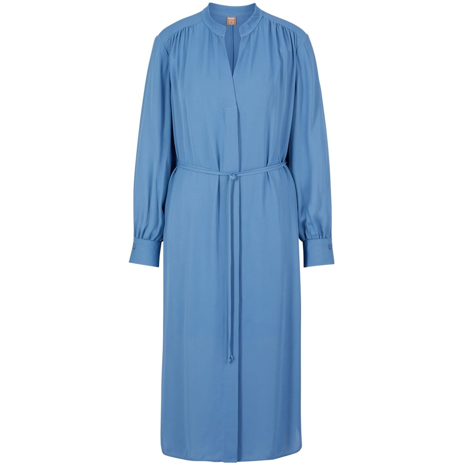 This Boss shirt dress is a sophisticated choice for any wardrobe. Crafted in a solid pattern, it features a notched neck and a band collar, adding a touch of elegance. The midi length and long cuff sleeves offer a classic silhouette, while the tie closure ensures a comfortable fit. The straight hem and regular fit complete this timeless piece, perfect for various occasions. -