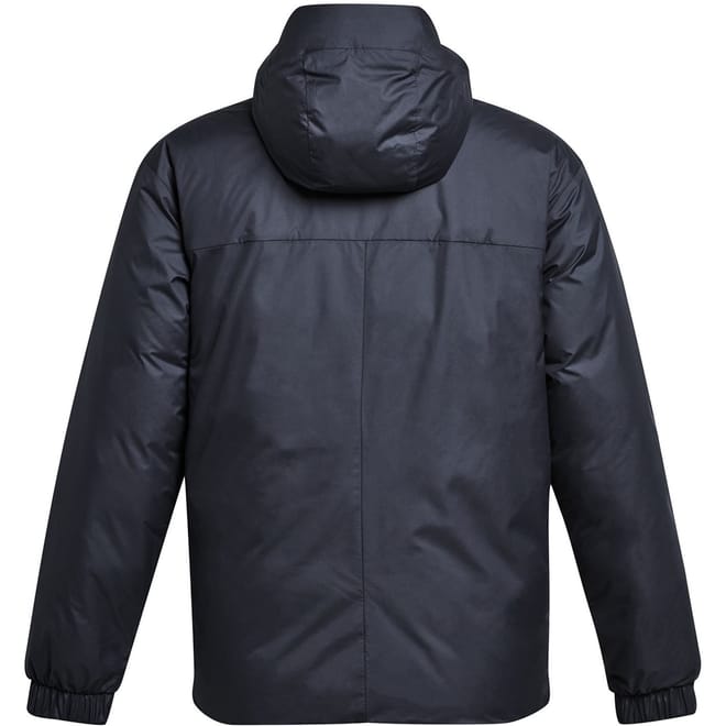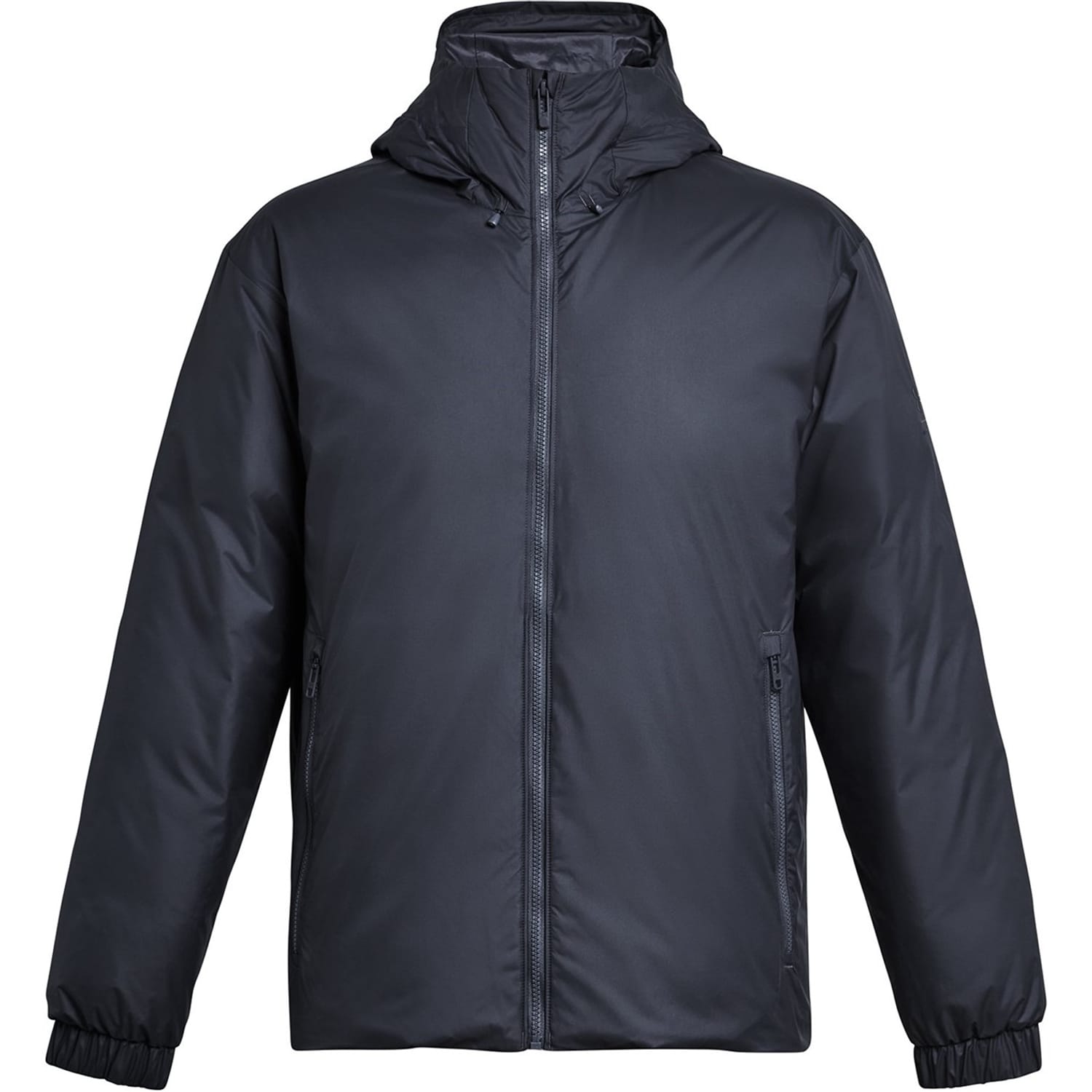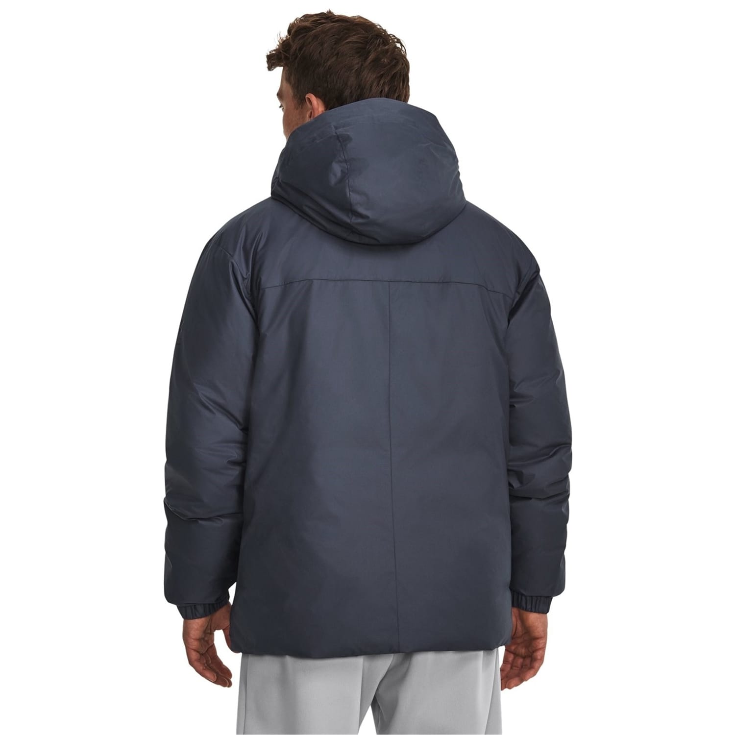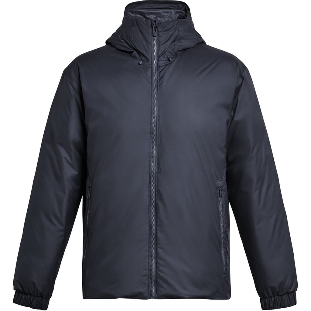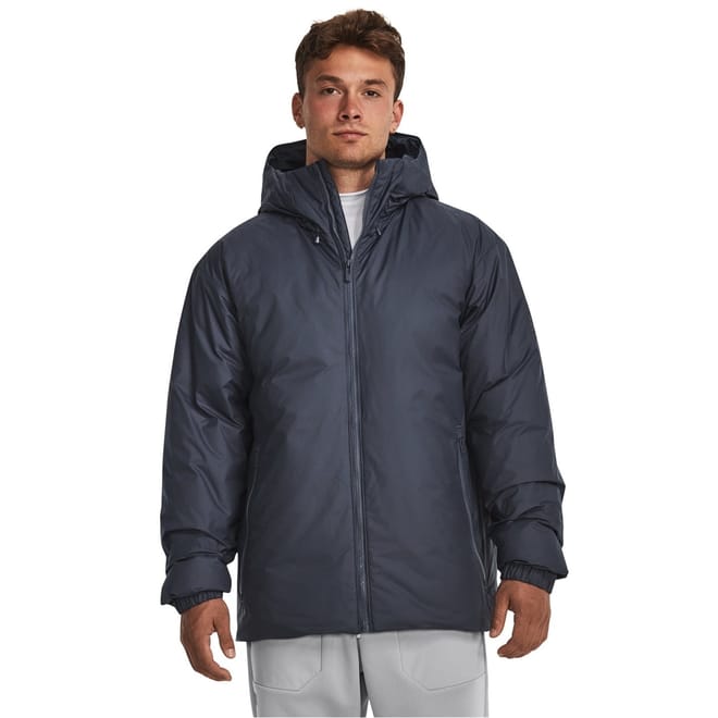 This Under Armour puffer coat is designed with a hooded neck and a zipper closure, offering a regular fit. It features a lightweight, down-filled construction with a solid pattern. The coat includes an elasticated cuff and a straight hem, complete with a logo embellishment for a touch of brand identity. -