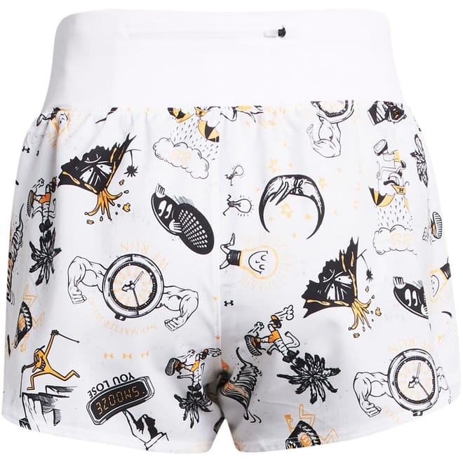 Under Armour running shorts are designed for performance, featuring a drawstring closure for a secure fit. These activewear shorts come with practical pockets, including a zipped pocket, and showcase a graphic print with lettering. Ideal for casual and athletic activities, they offer functionality and style in one. -