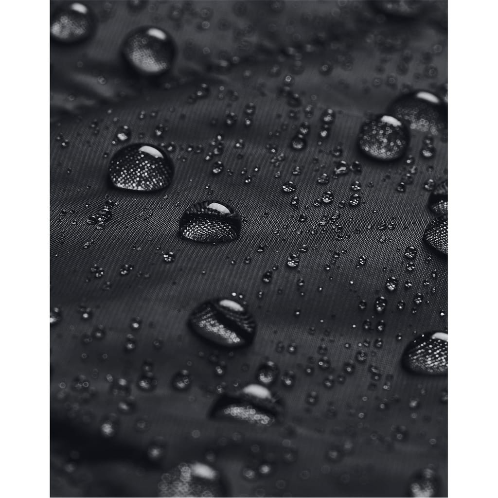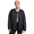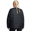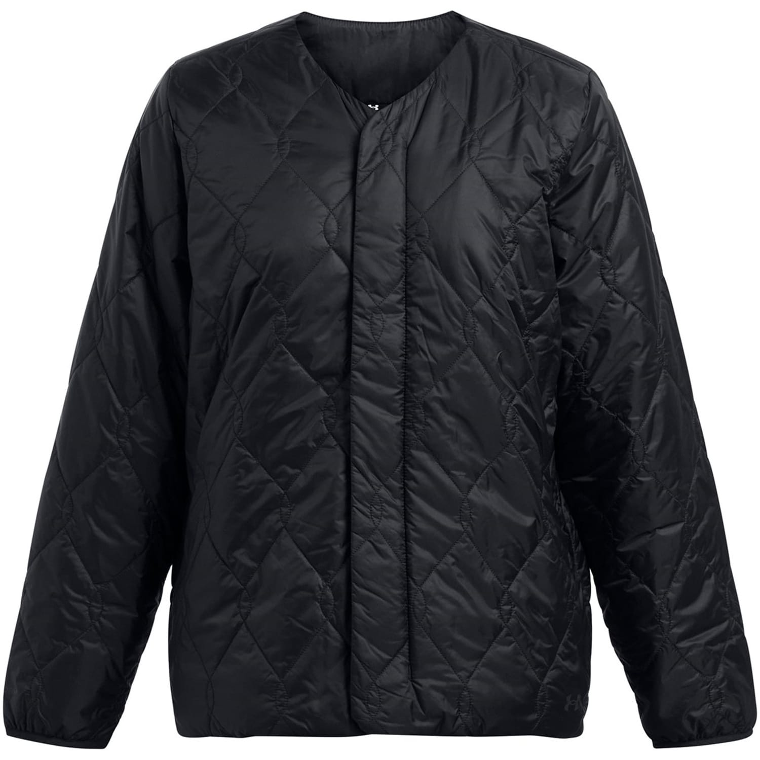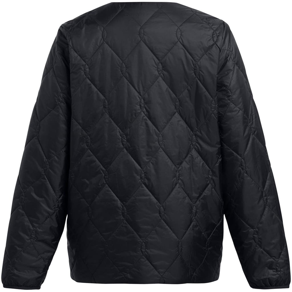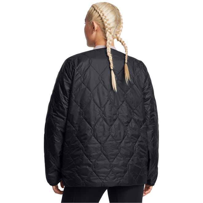 This Under Armour quilted puffer jacket features a relaxed fit and a straight hem. It is adorned with crystal embellishments, a logo, and practical zipped pockets. The jacket is designed with a ribbed pattern and offers a secure closure with snap buttons and a zipper. -