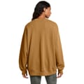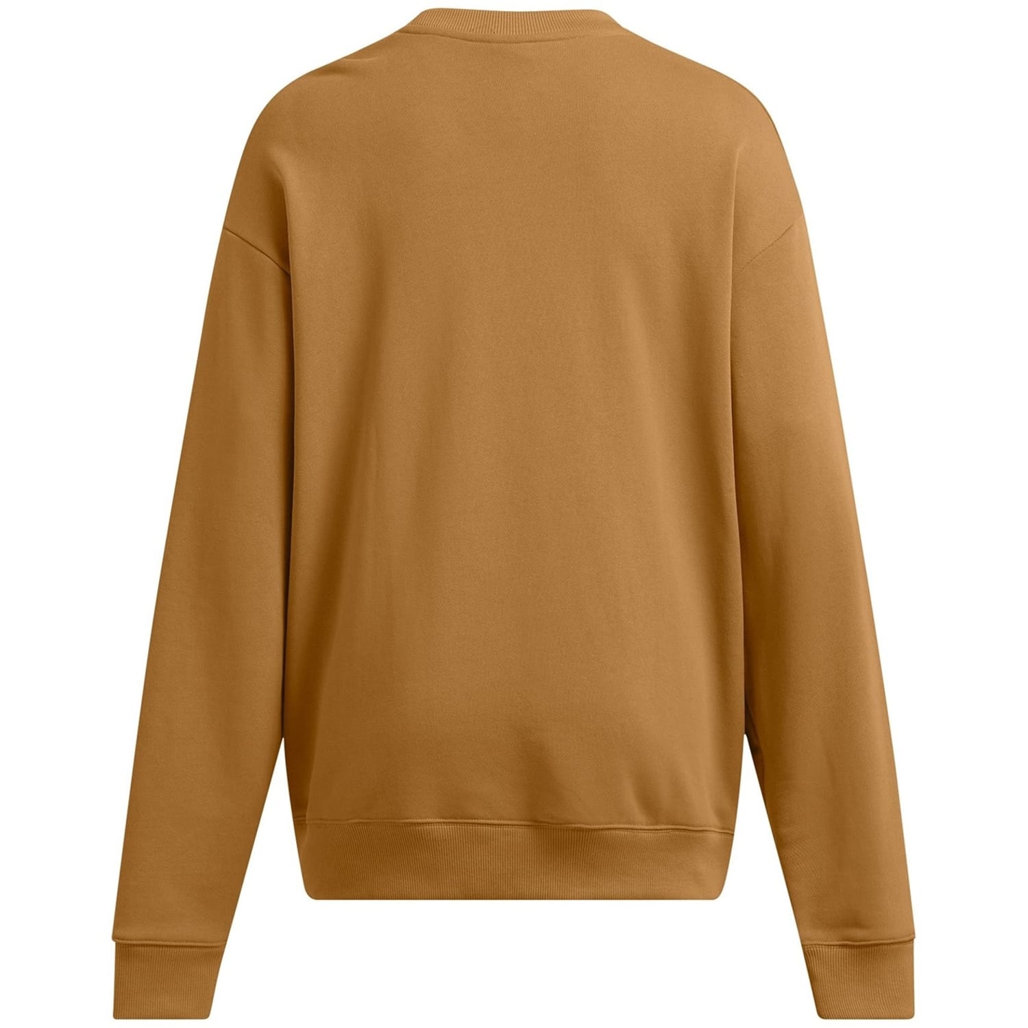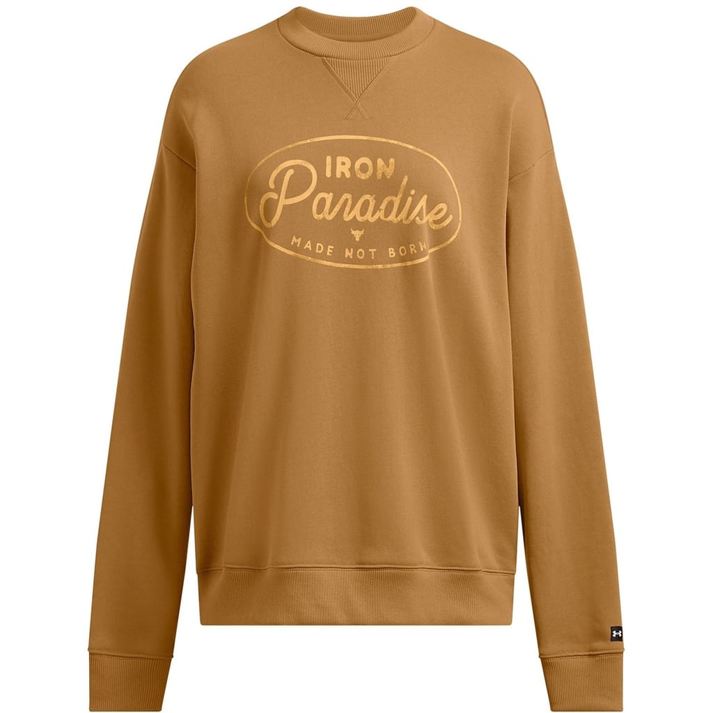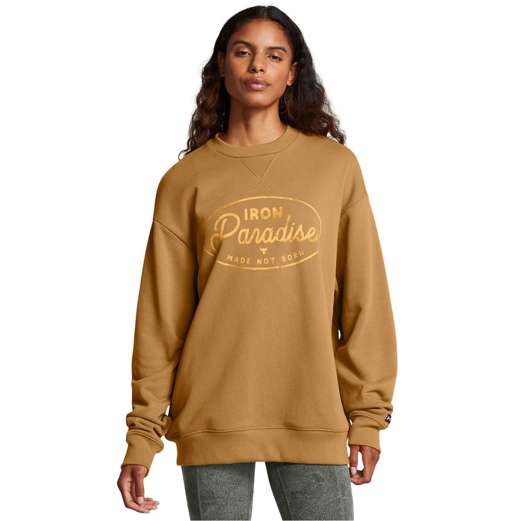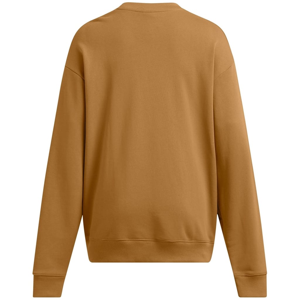 This Under Armour top features a relaxed fit with long sleeves and a drop shoulder design. It includes a ribbed collar and ribbed cuffs for added comfort. The top is adorned with a graphic print and lettering, complemented by a logo embellishment. -