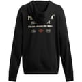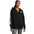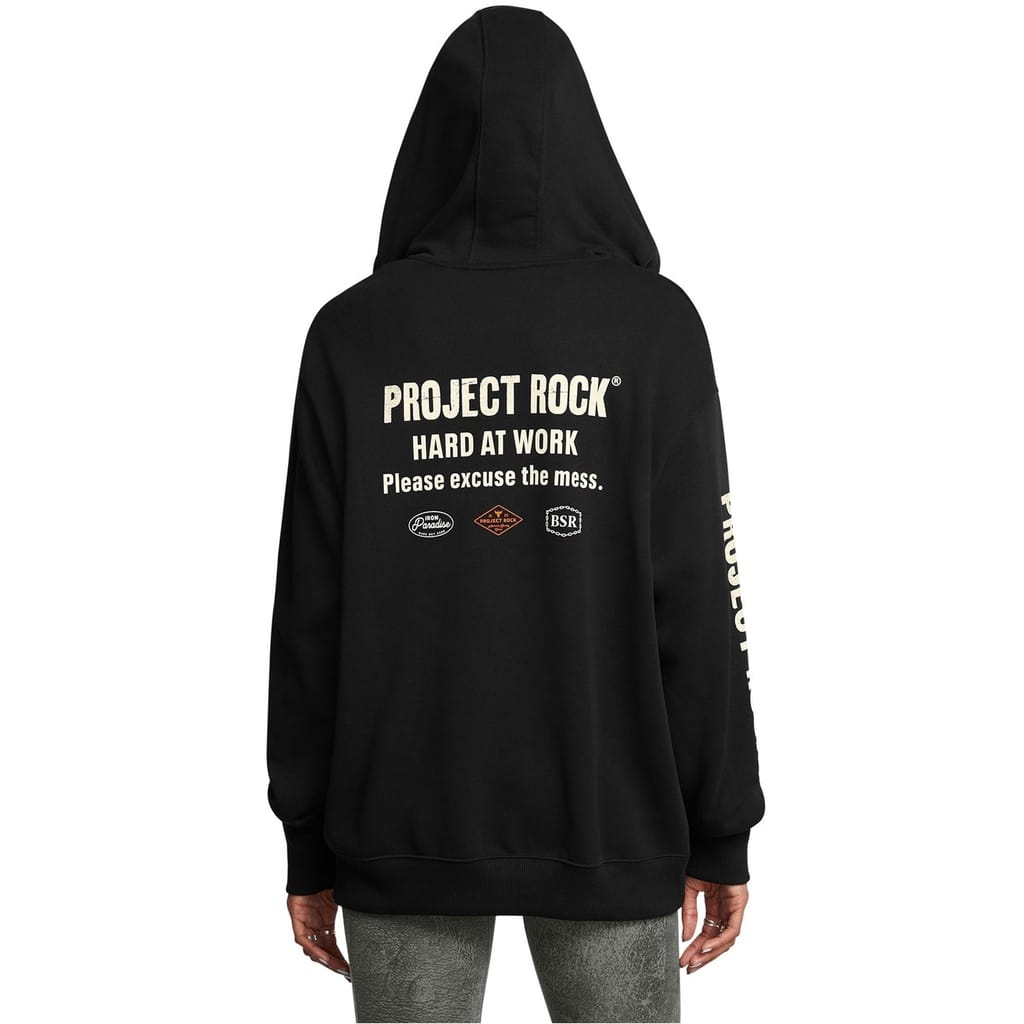 This Under Armour Project Rock top from the outerwear and activewear collections features a hooded neck and long sleeves. It has a relaxed fit with a ribbed cuff for added comfort. The solid pattern is complemented by a logo patch embellishment. The front zipper closure adds functionality to this versatile piece. -