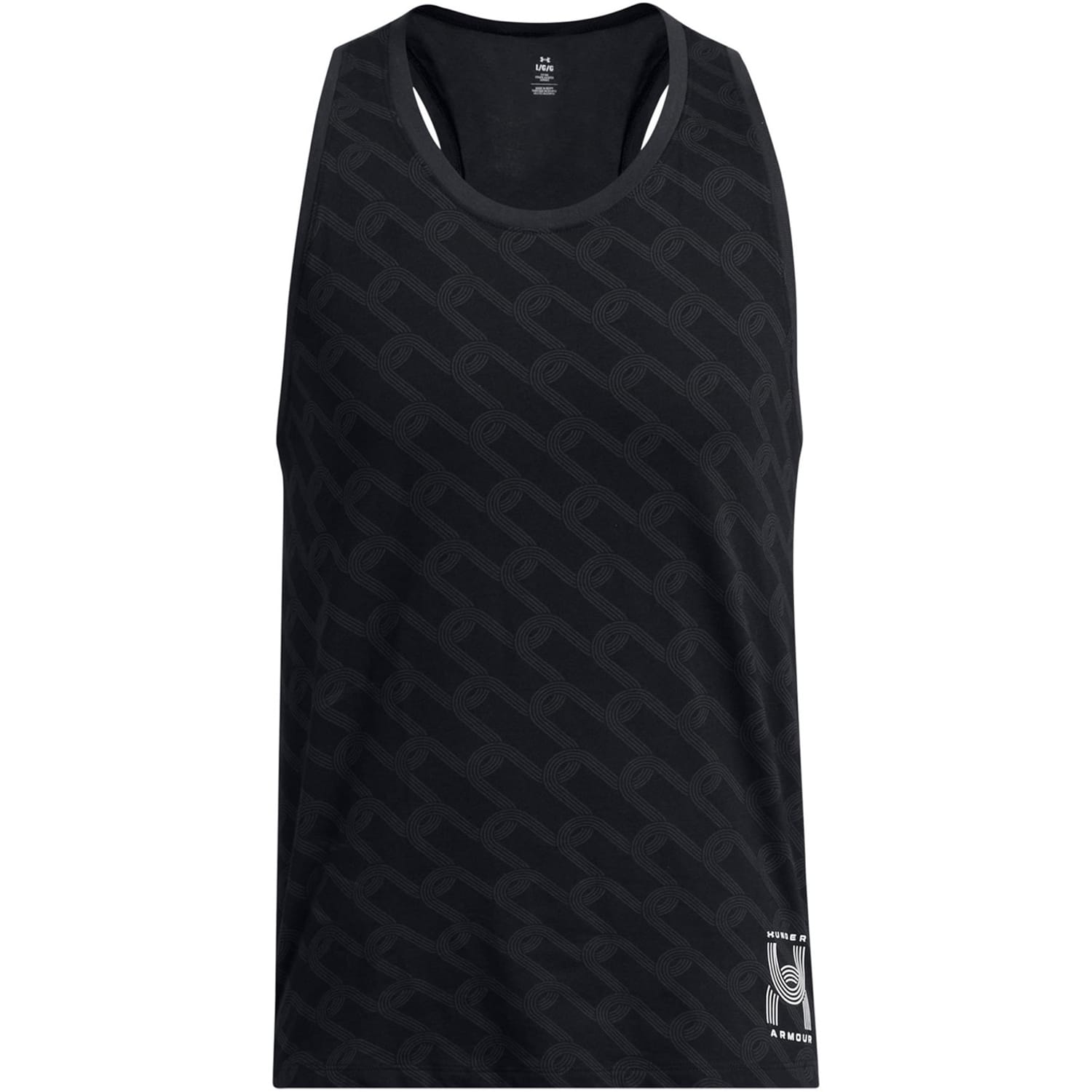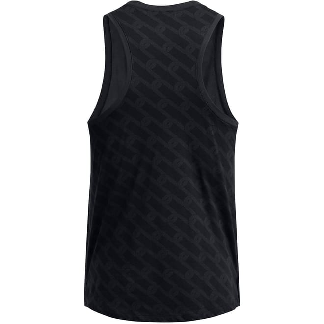 This Under Armour top is designed for activewear enthusiasts. Featuring a sleeveless design and a scoop neckline, it offers a regular fit for optimal performance. The top is adorned with an all-over logo pattern, adding a distinctive touch to your sporting activity wardrobe. -