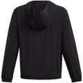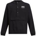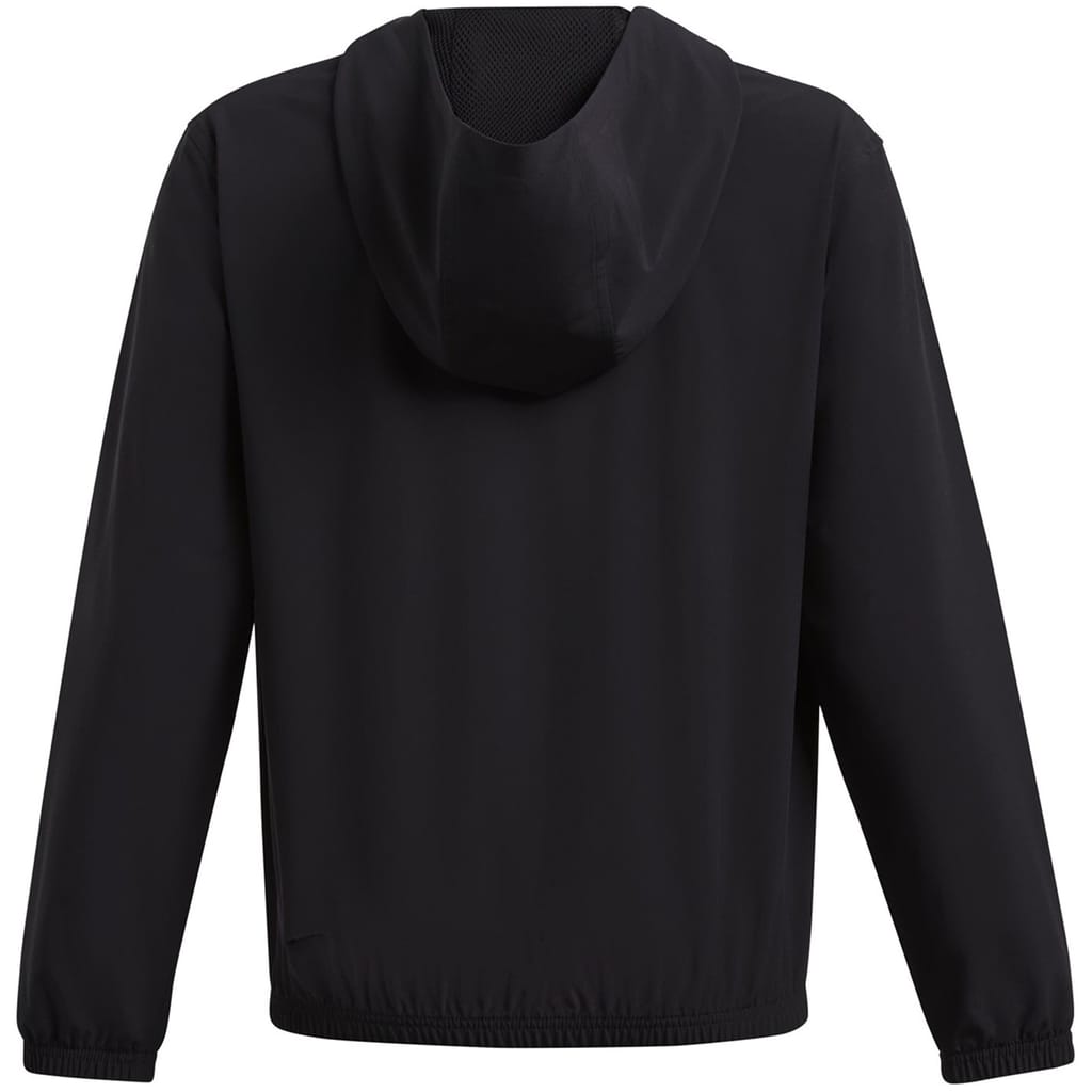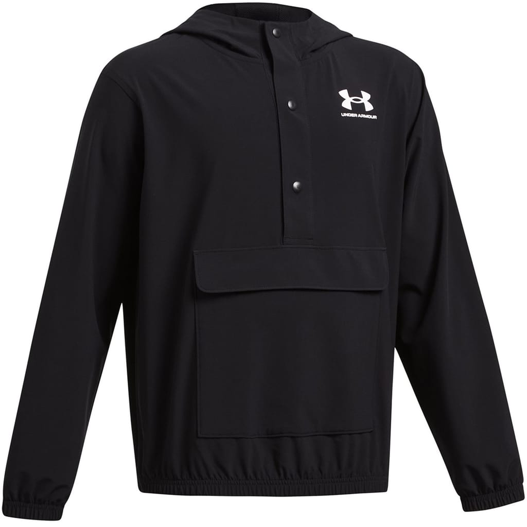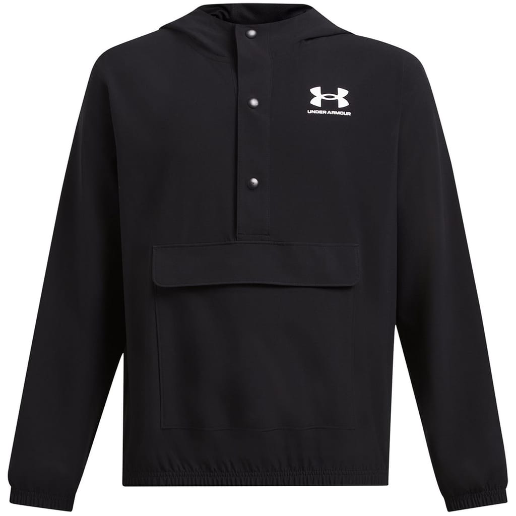 The Under Armour anorak jacket from the activewear collection is designed for performance. It features a hooded neck and a regular fit, with a solid pattern. The jacket includes a snap button closure, elasticated cuffs, and an elasticated hem. Crafted from woven materials, it is adorned with a logo embellishment, making it a practical choice for active pursuits. -