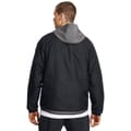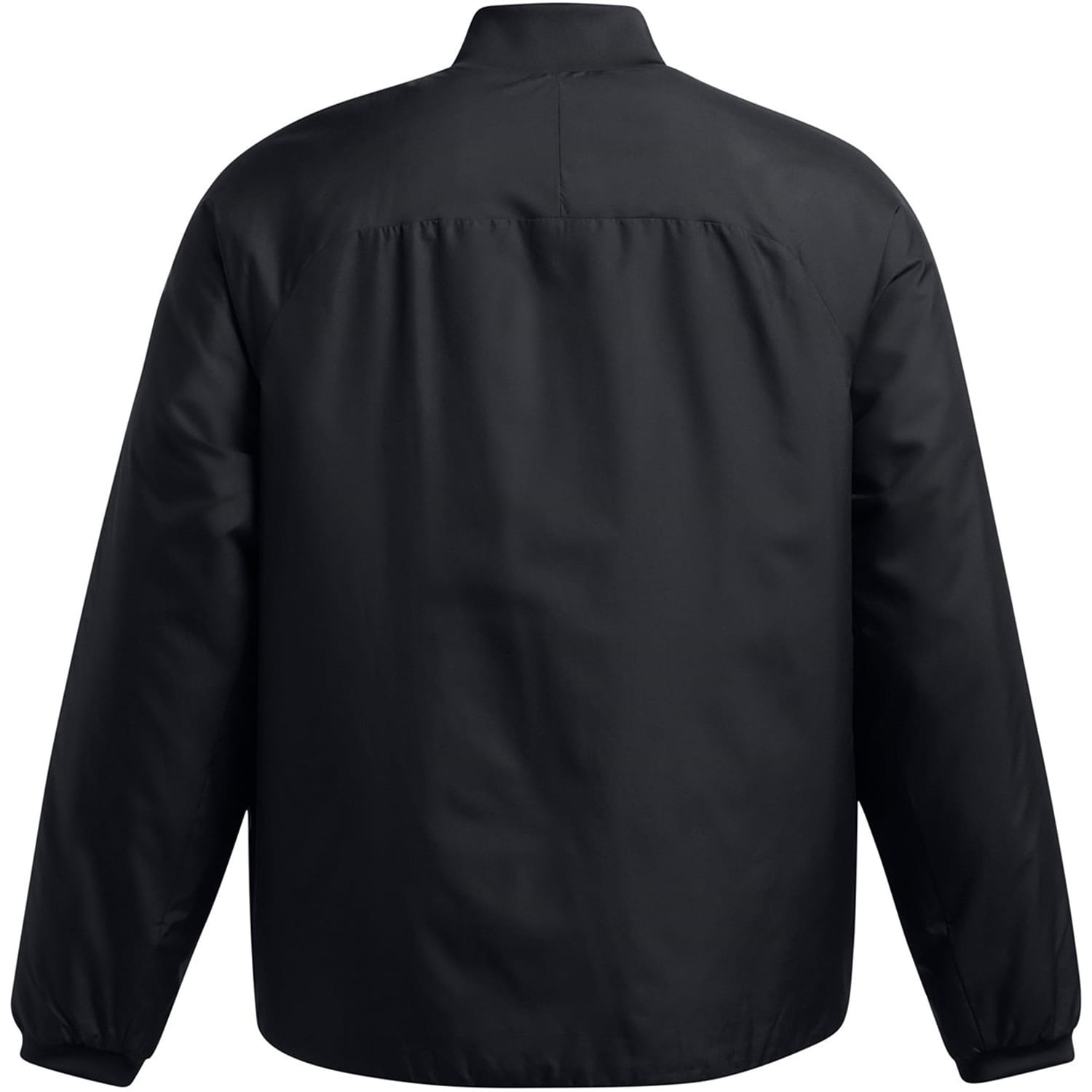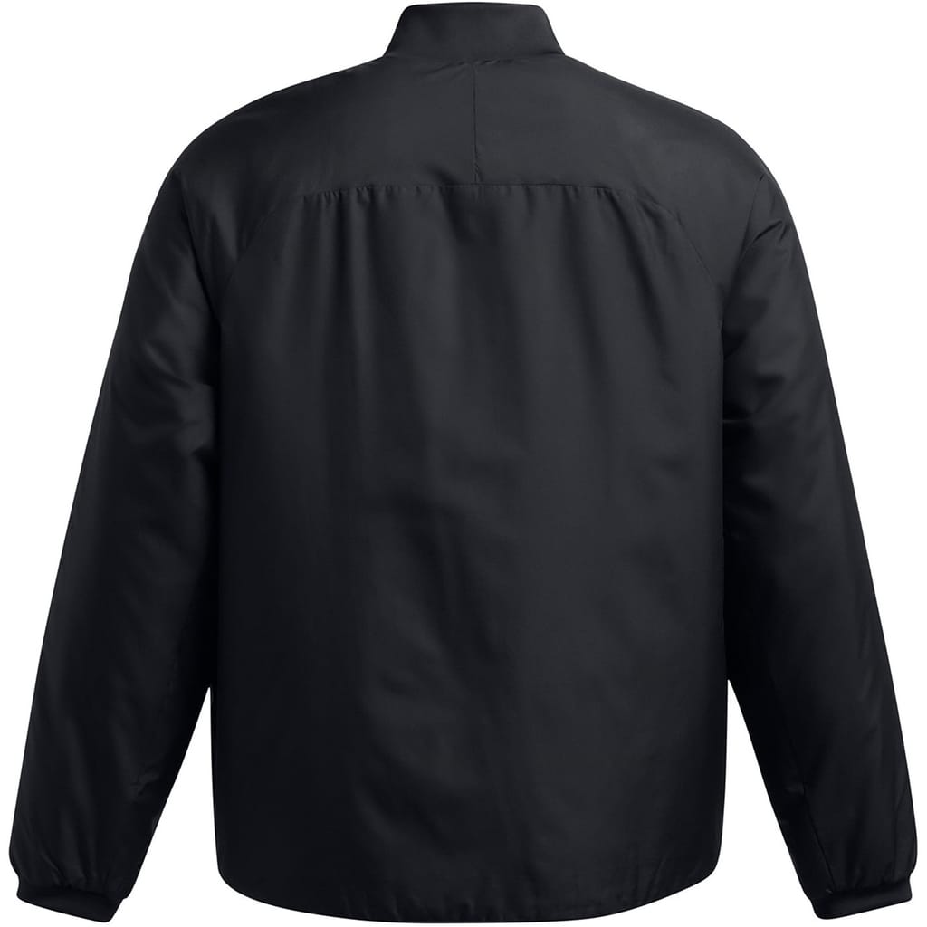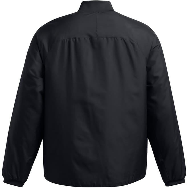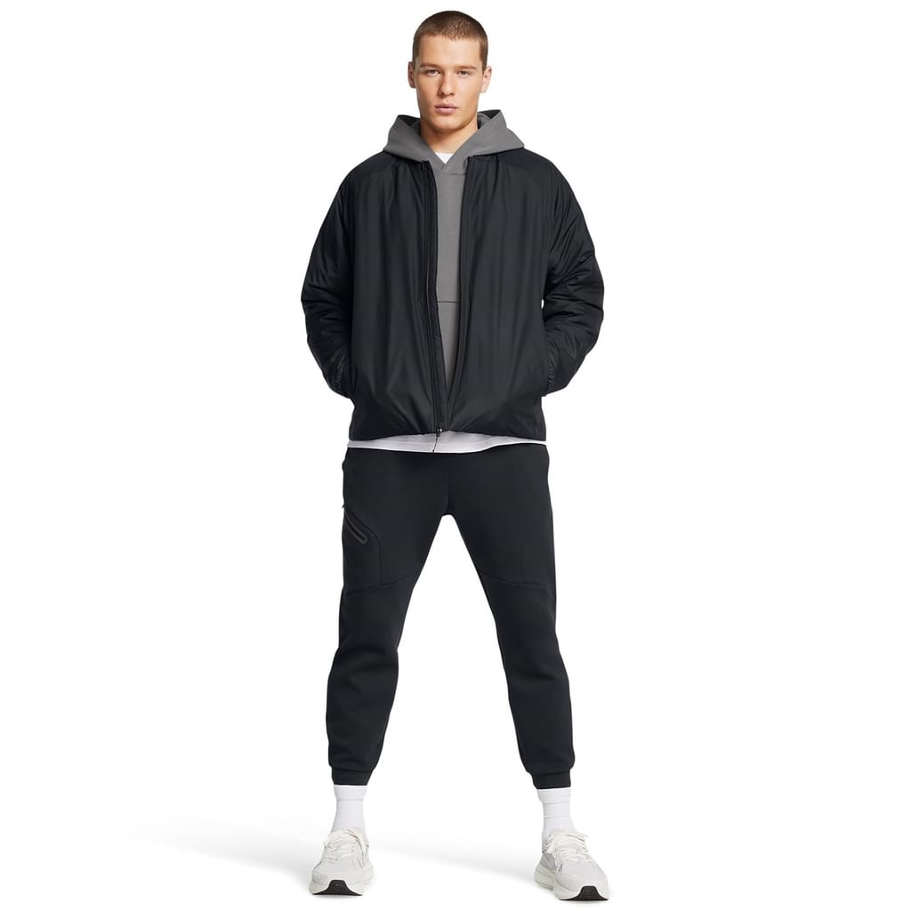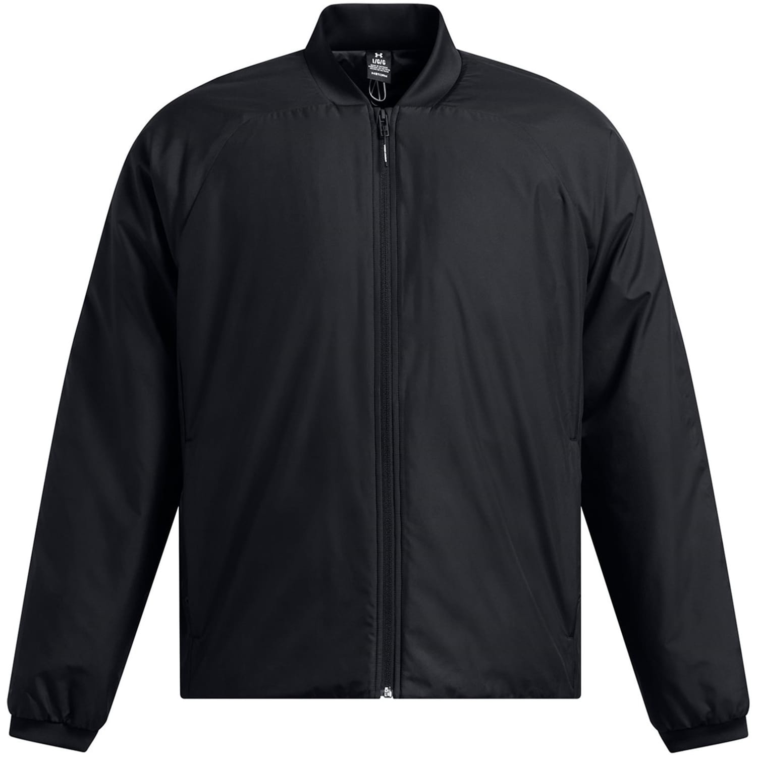 This Under Armour bomber jacket is a mid-weight, short-length piece featuring a bomber collar and a solid pattern. It has a regular fit with a zipper closure, ribbed cuffs, and a ribbed hem. The jacket is embellished with a logo, adding a touch of brand identity. -