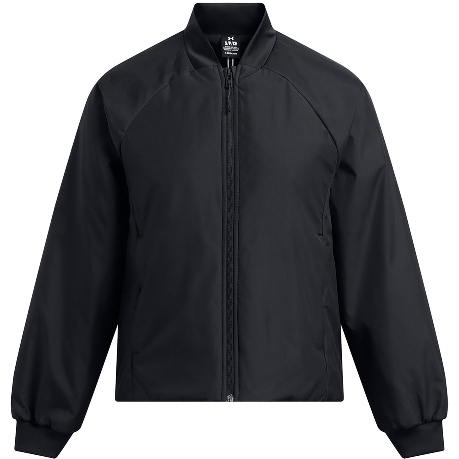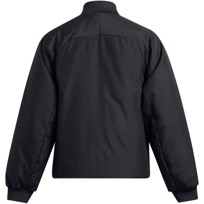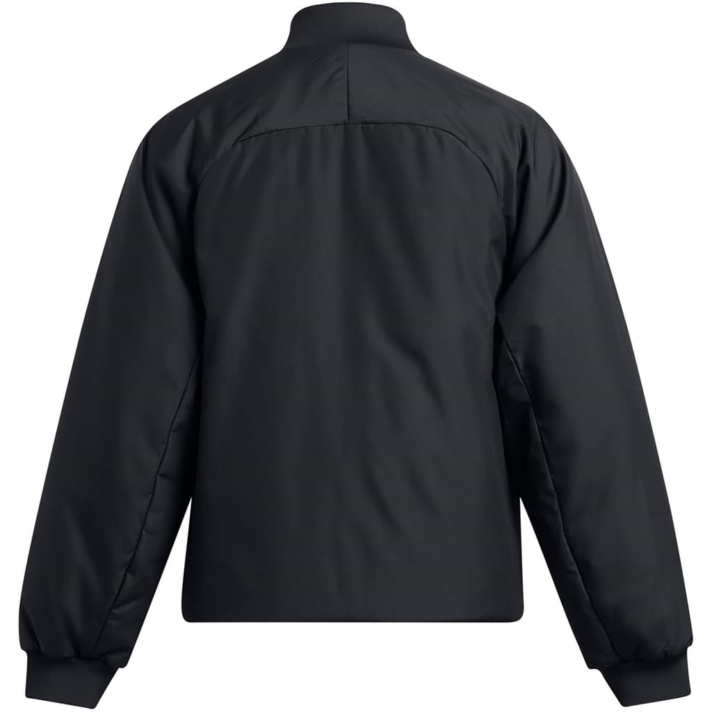 This Under Armour bomber jacket is designed for comfort and style. Featuring a relaxed fit, it is insulated and mid-weight, making it ideal for cooler weather. The jacket includes a bomber collar, ribbed cuffs, and a ribbed hem for a classic look. It has a solid pattern with a logo embellishment. The jacket is equipped with a zipper and snap button closure for secure fastening. -