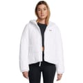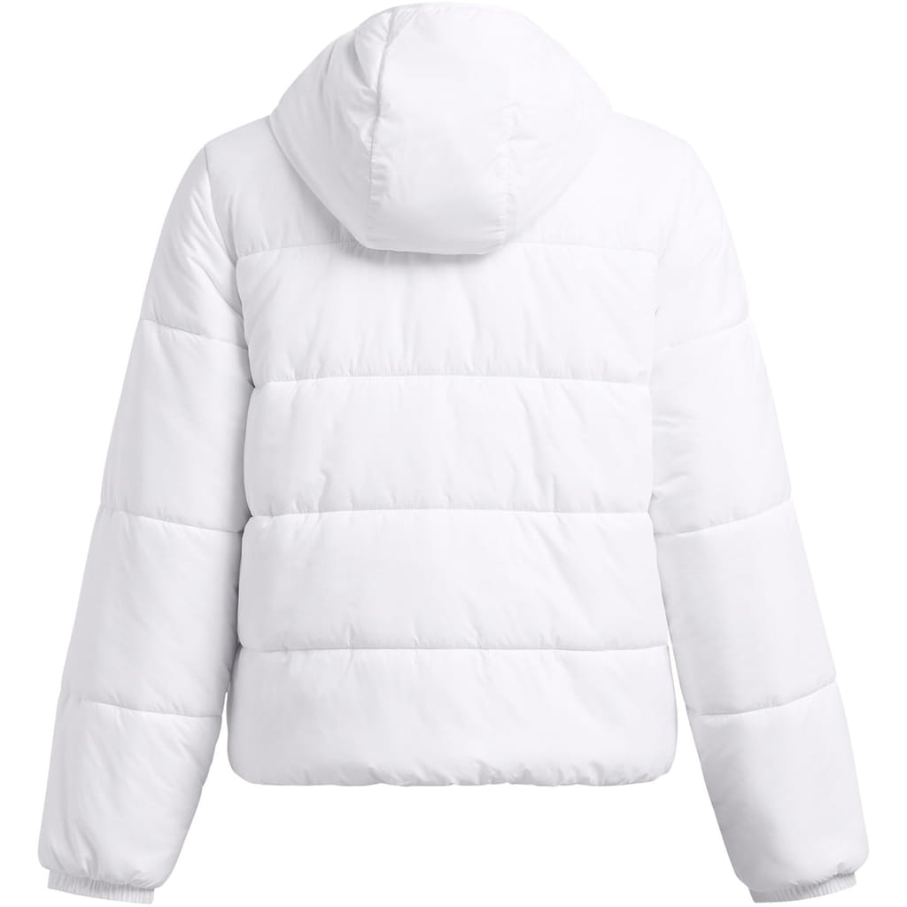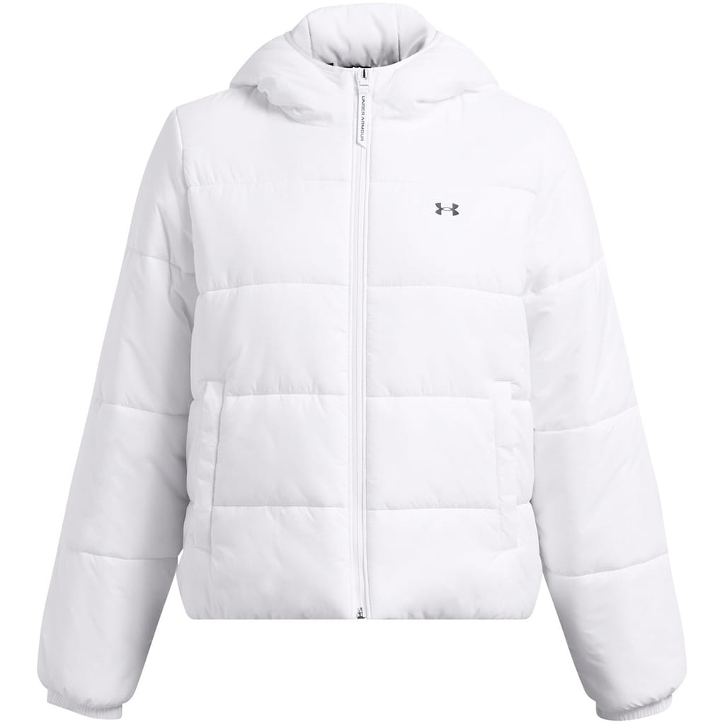 The Under Armour puffer jacket is a lightweight, insulated piece designed for comfort and warmth. Featuring a hooded neck and a relaxed fit, it offers practicality with a zipper closure and elasticated cuffs. The solid pattern and straight hem provide a clean look, while the logo embellishment adds a touch of brand identity. -