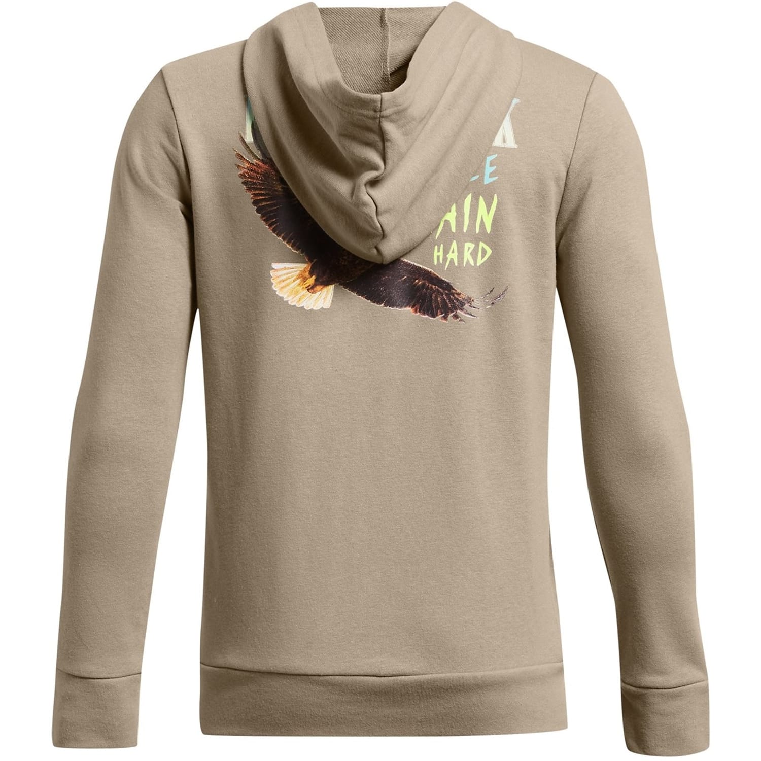 This Under Armour top is designed for performance and casual wear. Featuring a hooded neck and long sleeves, it offers a regular fit with ribbed cuffs for added comfort. The full zipper closure ensures easy wear, while the large genie graphic print adds a distinctive touch. Suitable for all seasons, this outerwear piece is embellished with a logo, making it a versatile addition to your wardrobe. -