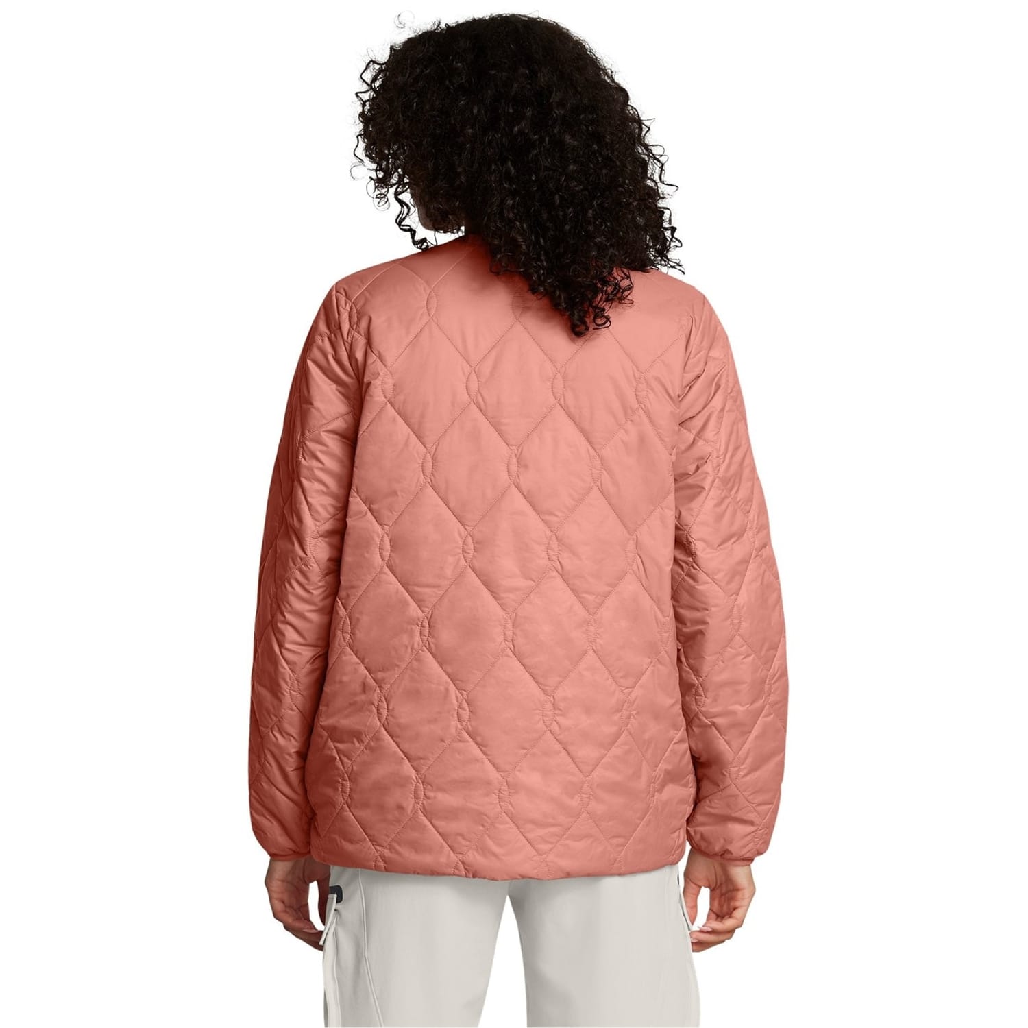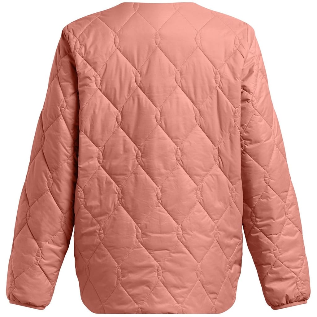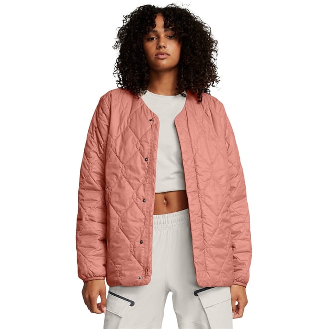 This Under Armour puffer jacket features a relaxed fit and is adorned with crystal embellishments and practical pockets. The quilted design adds texture, while the snap button closure ensures ease of wear. Ideal for those seeking a stylish yet functional outerwear option. -