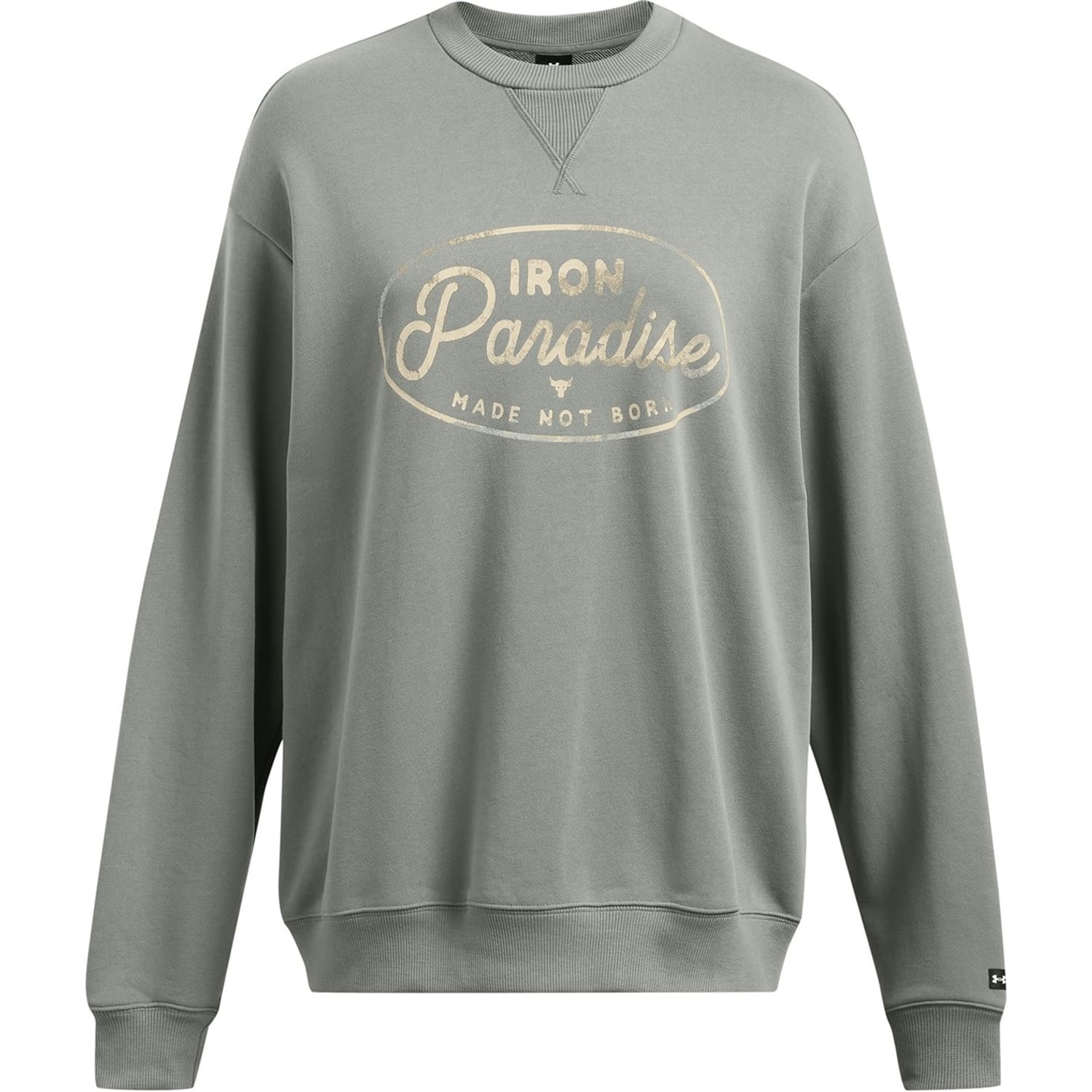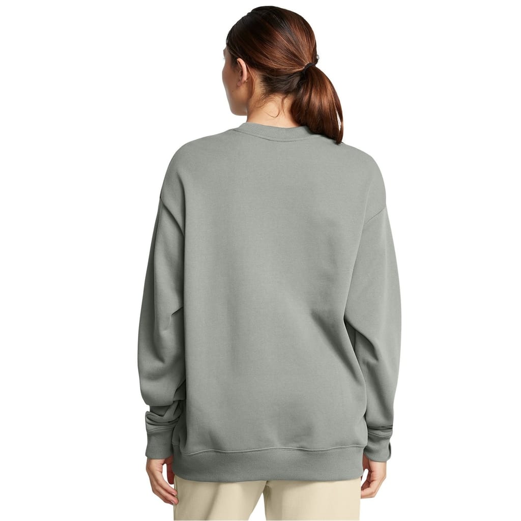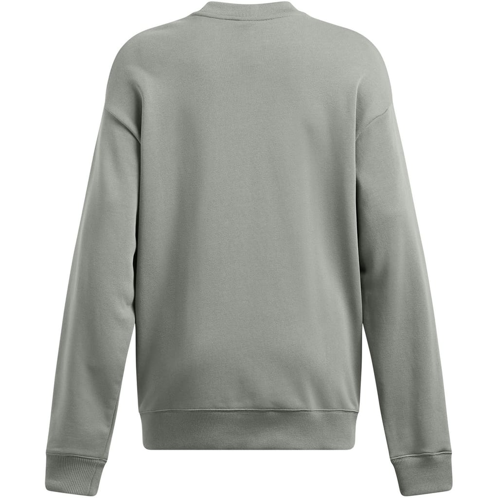 This Under Armour top features a relaxed fit with long sleeves and a drop shoulder design. It includes a ribbed collar and ribbed cuffs for added comfort. The top is adorned with a graphic print and lettering, complemented by a logo embellishment, making it a stylish choice for casual wear. -