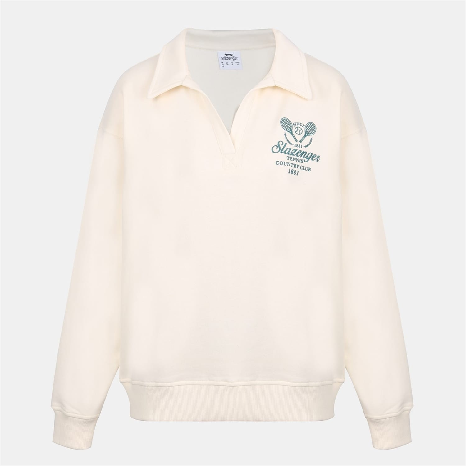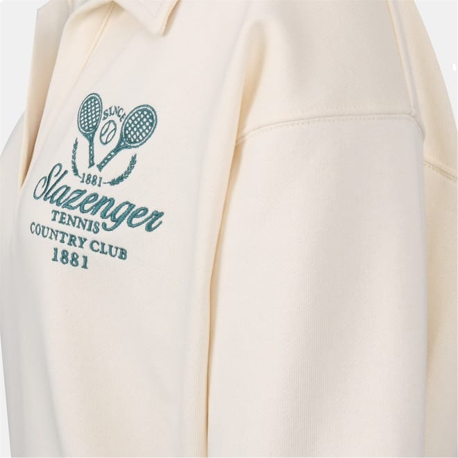 This Slazenger top features a crew neck and long sleeves with a drop shoulder design, offering a relaxed fit. The ribbed cuffs add a touch of detail, while the solid pattern provides a classic look. The top is embellished with an embroidered logo, making it a stylish choice for sporting activities. -