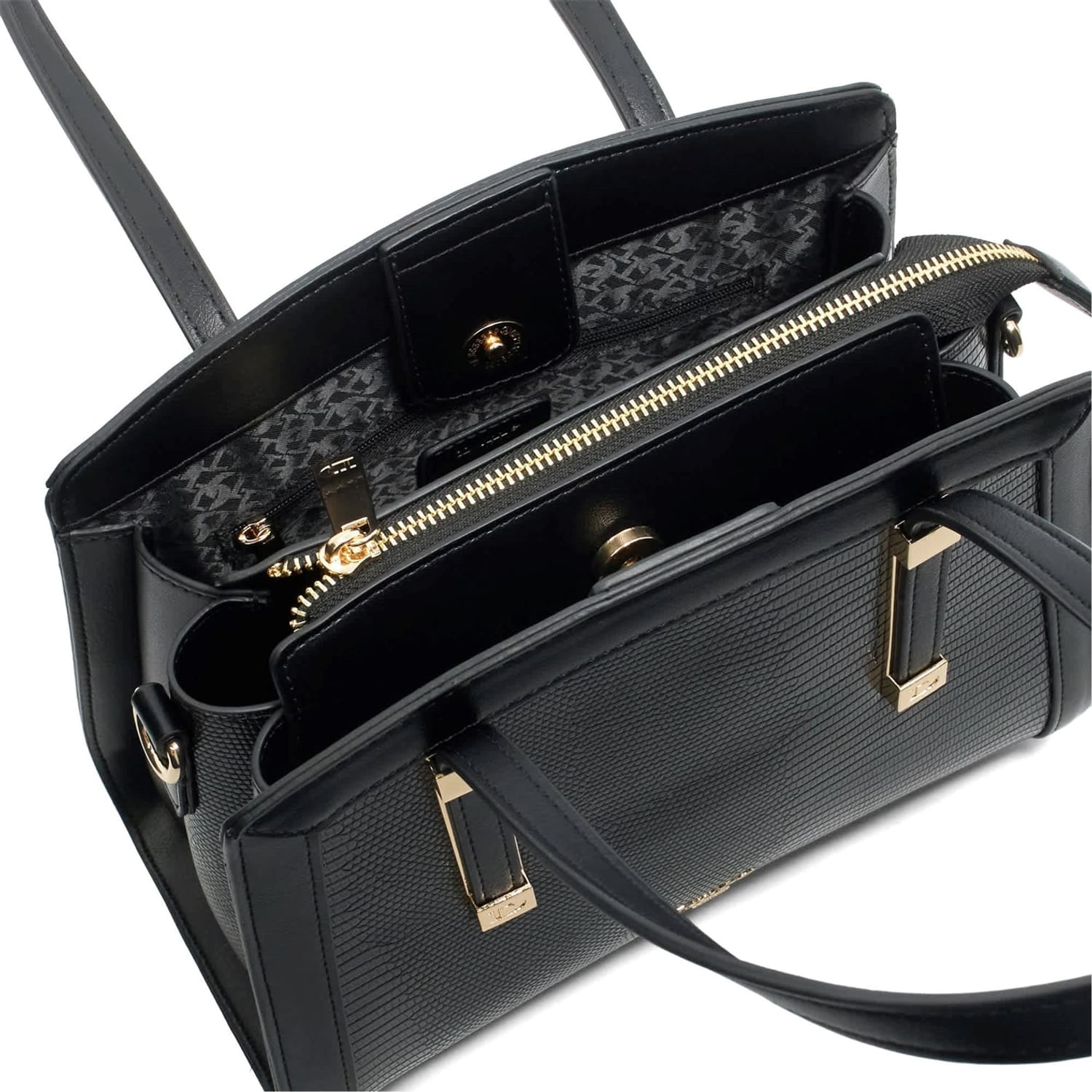 Discover the Dune London tote, a sophisticated addition to your collection. This snake skin textured bag features a magnetic and zipper closure, ensuring your essentials are secure. The double handle design offers comfort and style, while the logo embellishment adds a touch of elegance. A zipped pocket provides additional storage, making it both practical and chic. -