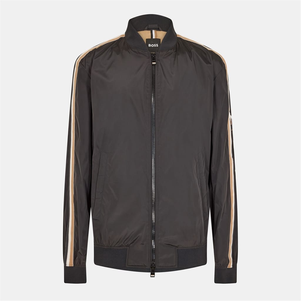 This Boss hybrid jacket features a regular fit with a stylish stripe pattern. It includes a zipper closure and is adorned with a logo embellishment. The jacket is designed with raglan sleeves, a ribbed collar, ribbed cuffs, and a ribbed hem, offering both comfort and a modern look. -